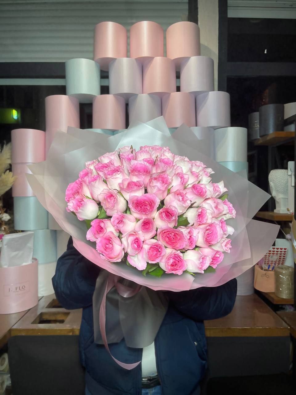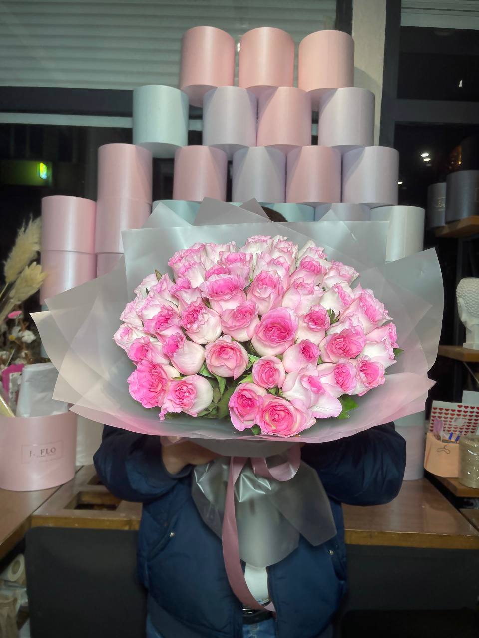 Сто одна голландская роза в букете — это история о масштабе и впечатлении. Объем композиции наполняет комнату и мгновенно притягивает внимание своим присутствием.