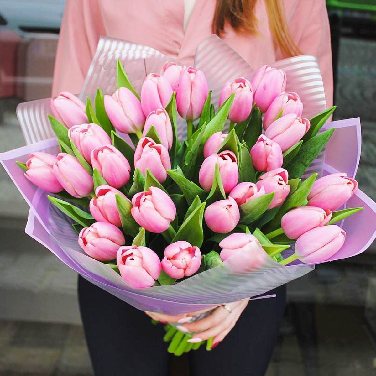 25 тюльпанов нежно-розового оттенка, лента, дизайнерская пленка.