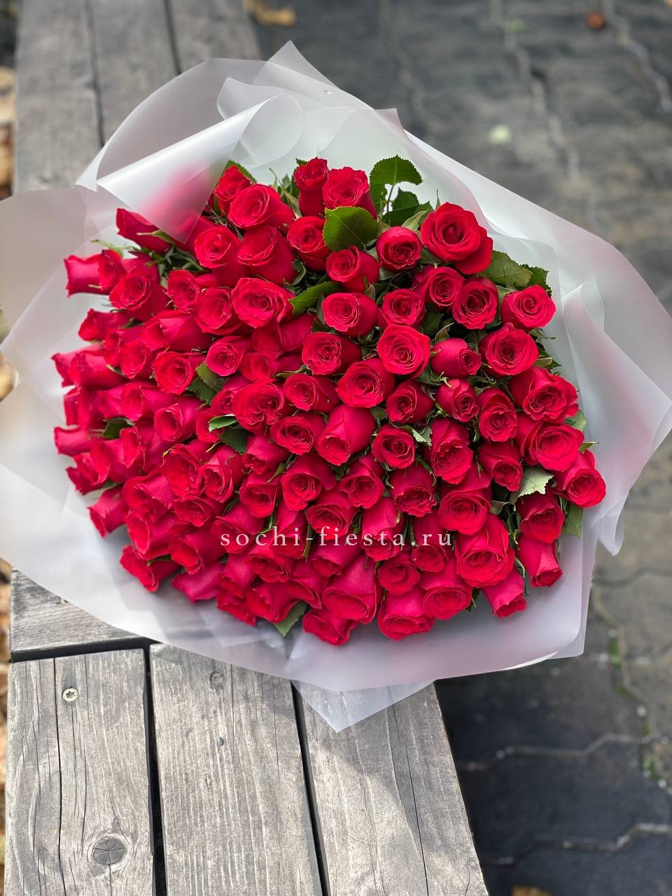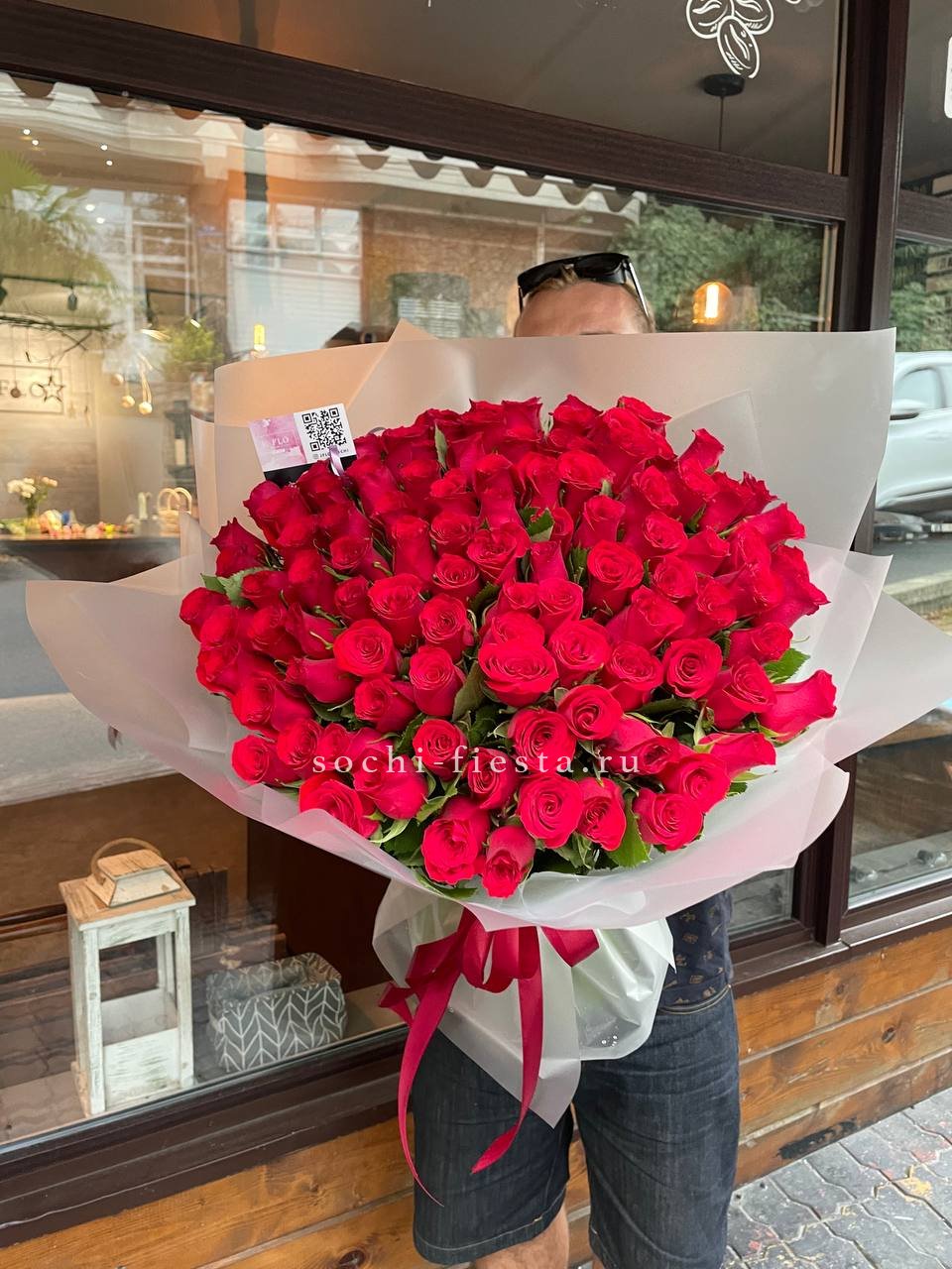 Тридцать один бутон насыщенного красного оттенка собраны в плотную композицию. Упаковка мягко обрамляет цветы, сохраняя естественную форму и позволяя каждому бутону раскрыться в своем ритме.