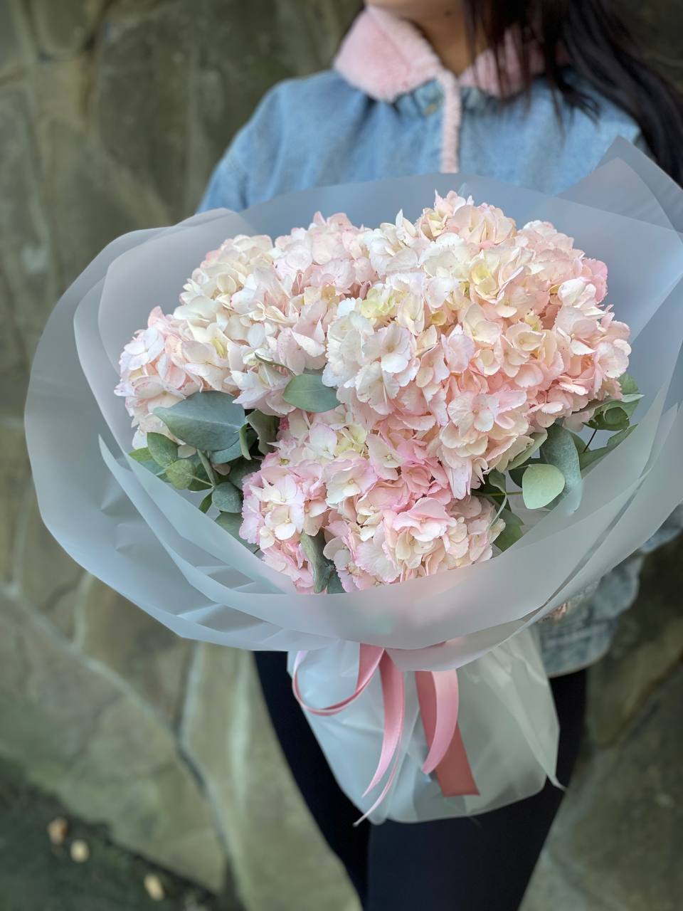 розовые гортензии, эвкалипт, пленка.