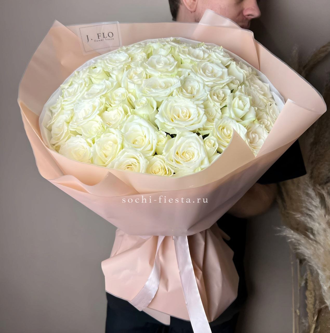Пятьдесят один бутон в лаконичной упаковке из тишью и плёнки. Белые розы образуют плотный купол, где каждый цветок находит своё место в общей структуре букета.