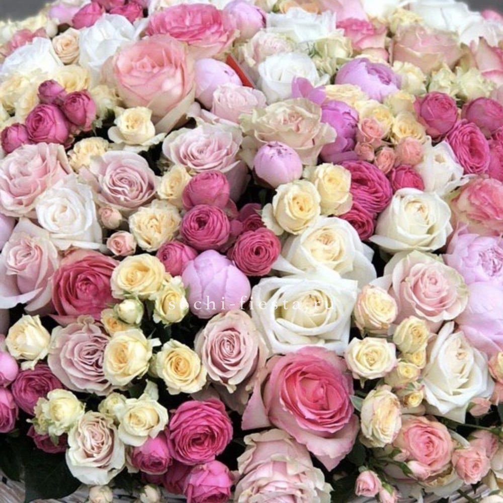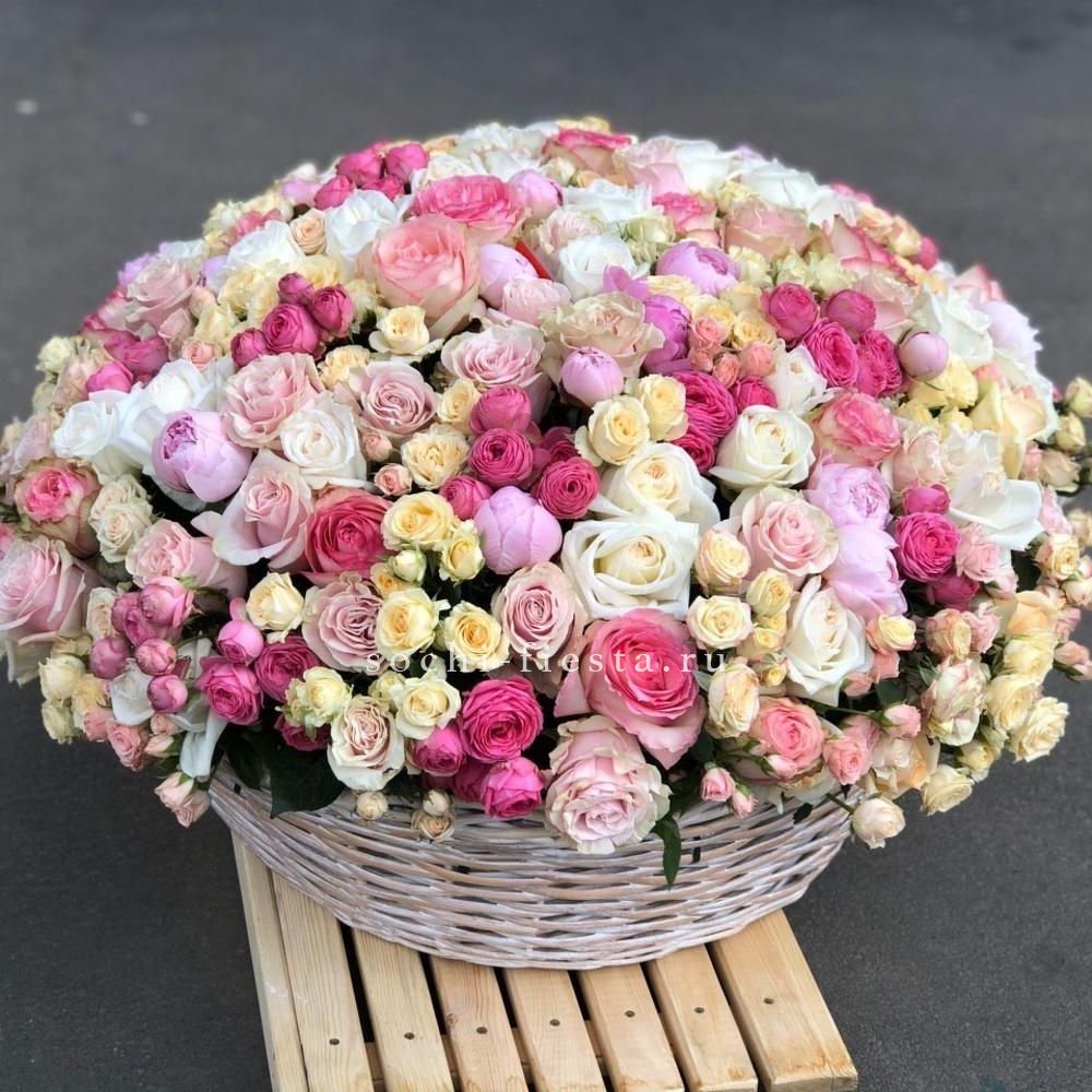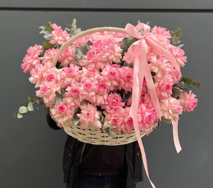 То самое «облако» нежности, о котором мечтает каждая! Эта огромная корзина французских роз поражает своим объемом и воздушностью. Специальная техника выворачивания лепестков превращает каждый бутон в пышное совершенство. Это не просто подарок, а масштабный жест любви и обожания, который точно запомнится надолго.