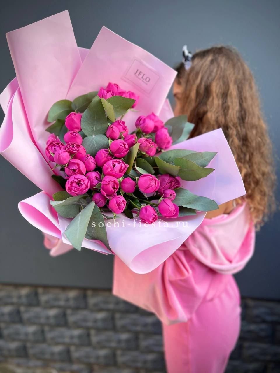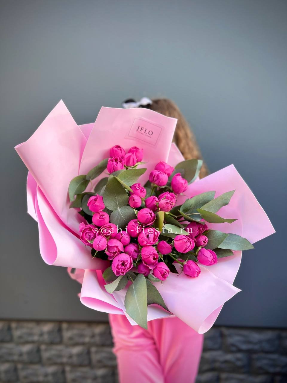 Семь вывернутых бутонов формируют плотный силуэт с выразительной вертикалью. Веточки эвкалипта задают ритм и направляют взгляд к центру композиции.
