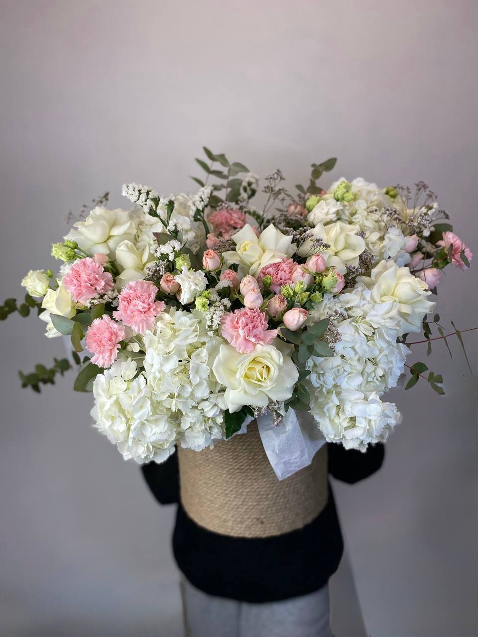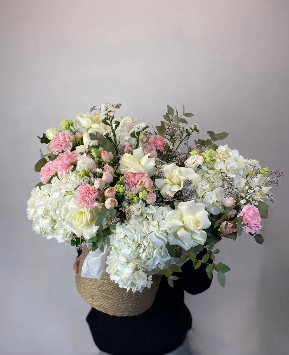 Семь гортензий в плетёной корзине держат форму и долго радуют свежестью. Компактная композиция удобна для размещения на столе или комоде без лишних хлопот.