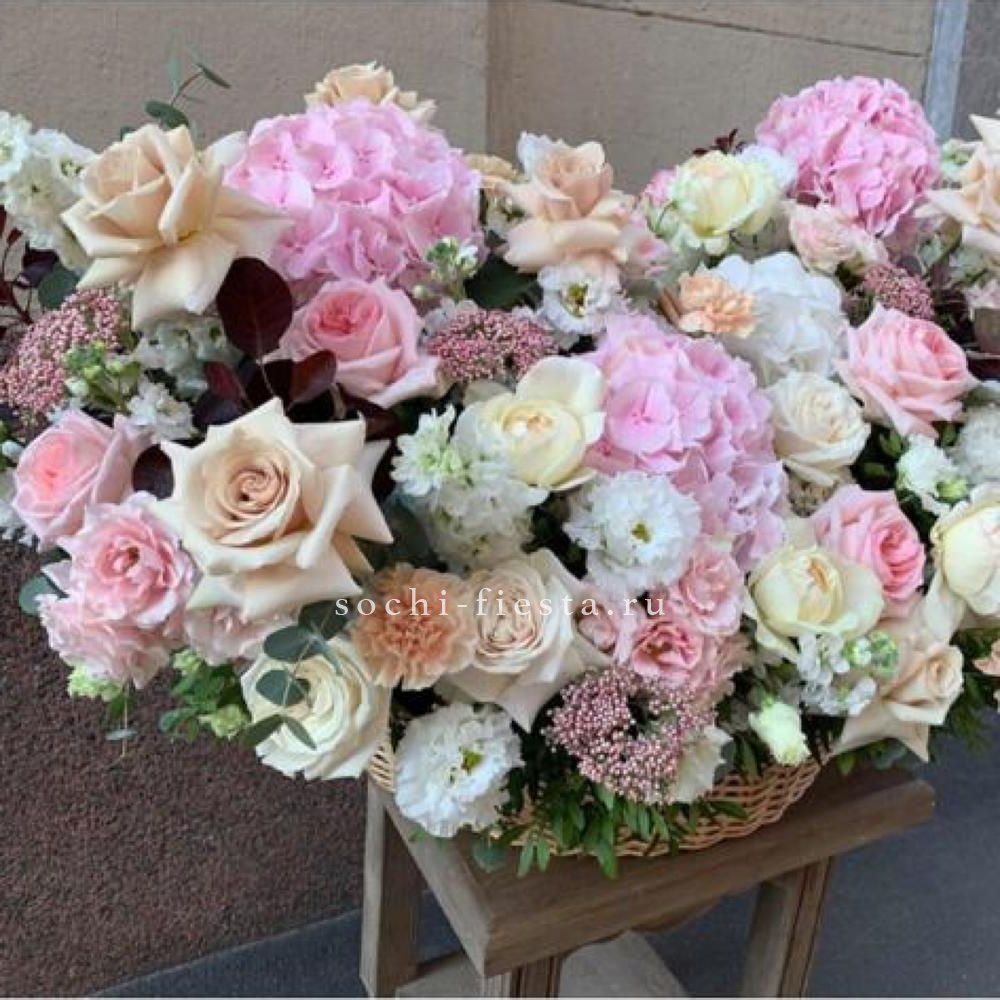 Пышная композиция с насыщенным цветением и многослойной глубиной. Пионовидные формы переплетаются с воздушной эустомой, создавая объём и плавный переход от центра к краям. Каждый бутон раскрыт по-своему.