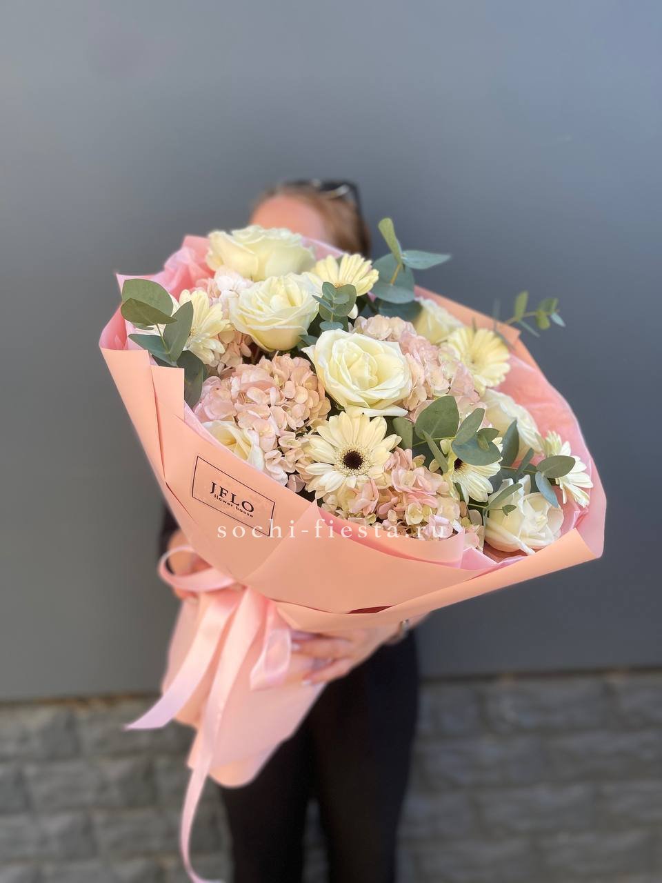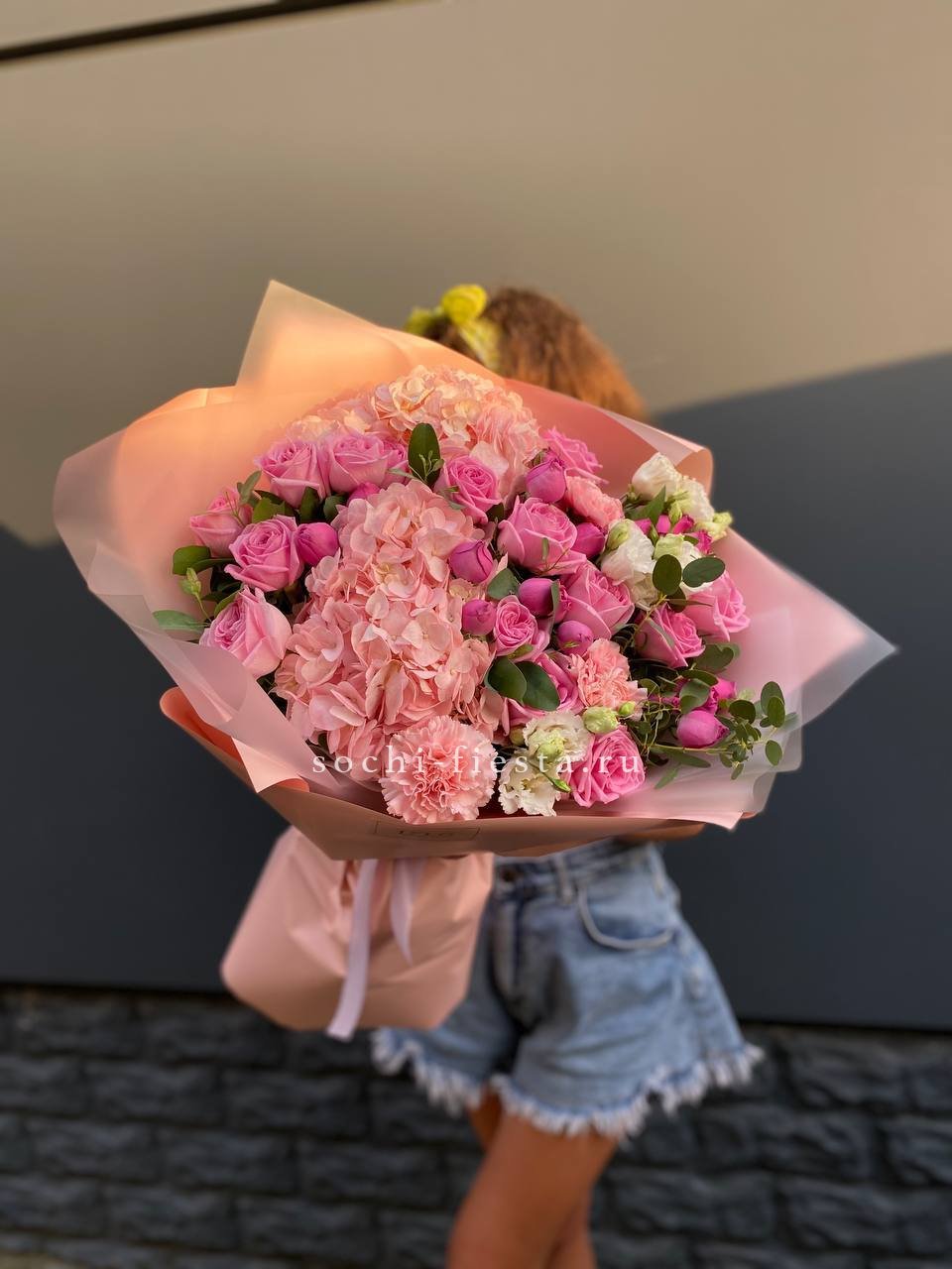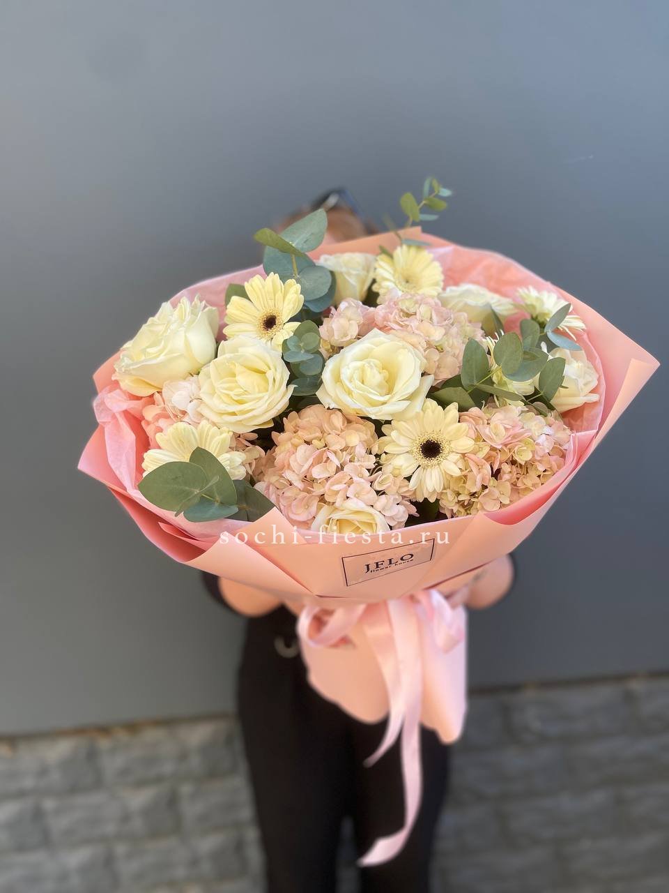 Пышная композиция объединяет крупные соцветия гортензии с бархатными розами и воздушной эустомой. Мисти бабблс и диантус создают мягкую дымку вокруг центральных бутонов. Веточки эвкалипта добавляют свежести и завершают образ.