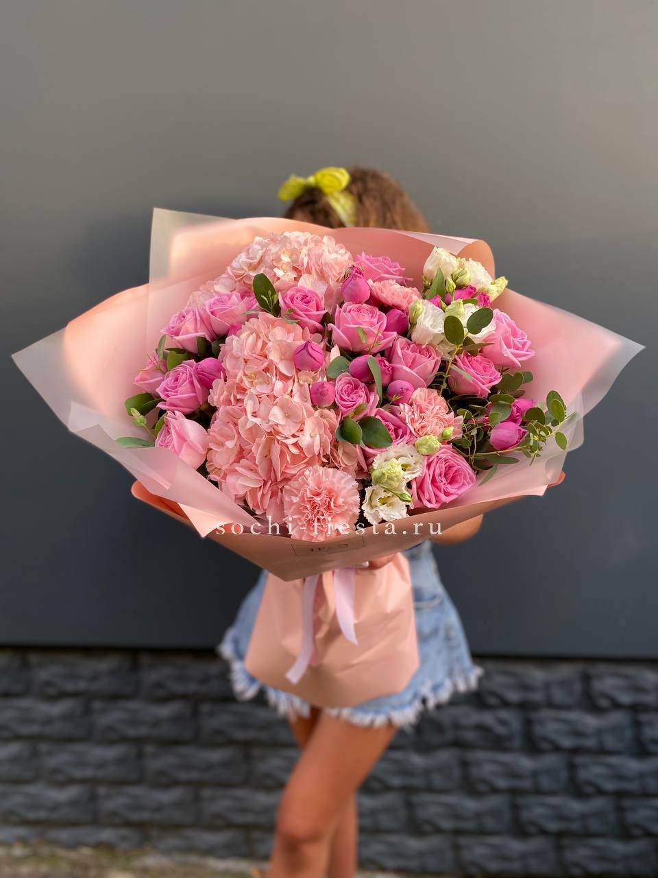 гортензия, мисти бабблс, роза, эустома, диантус, эвкалипт, авторская упаковка, лента