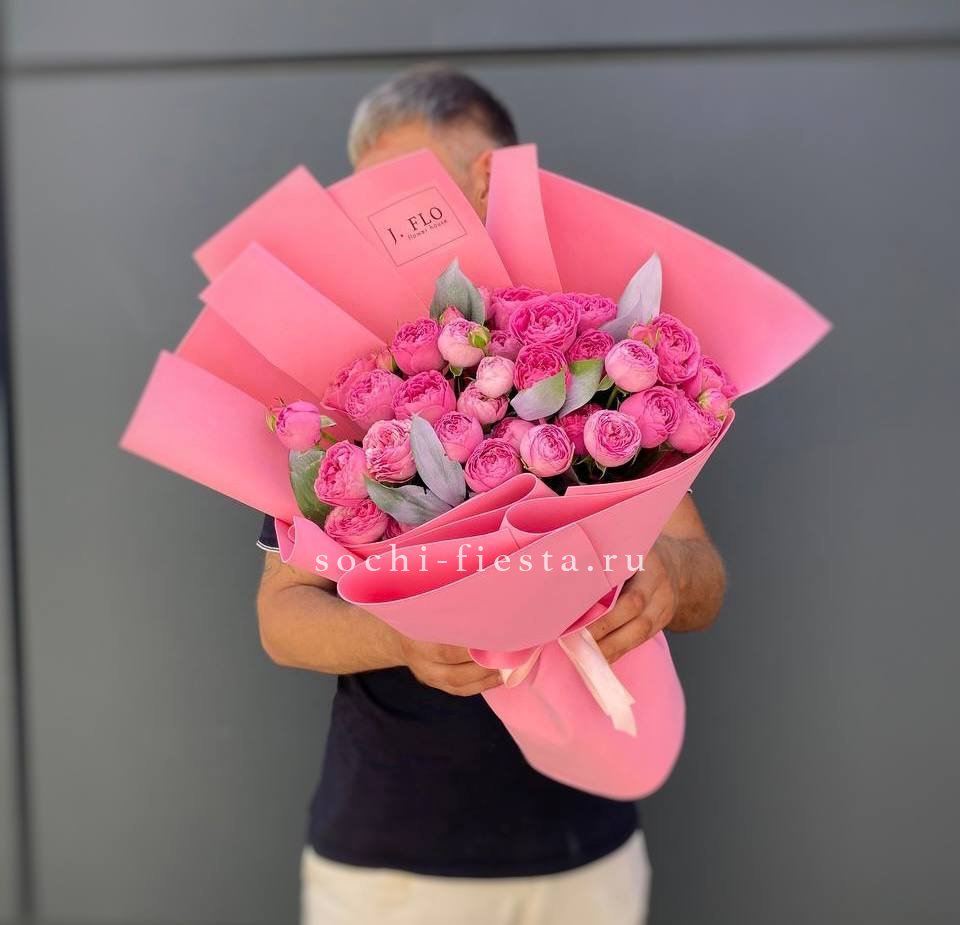 кустовые розы, эустома, хлопок, лента и дизайнерская пленка.