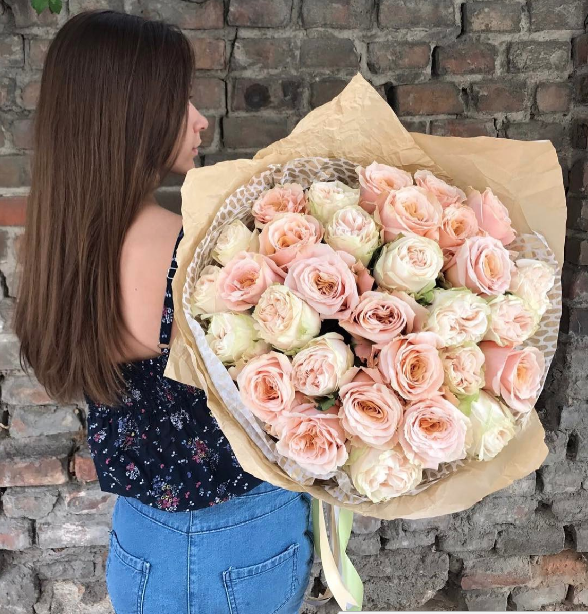 Белые и кремовые пионовидные розы создают мягкую палитру с переливами оттенков. Крафтовая упаковка добавляет естественности и легкости всей композиции.