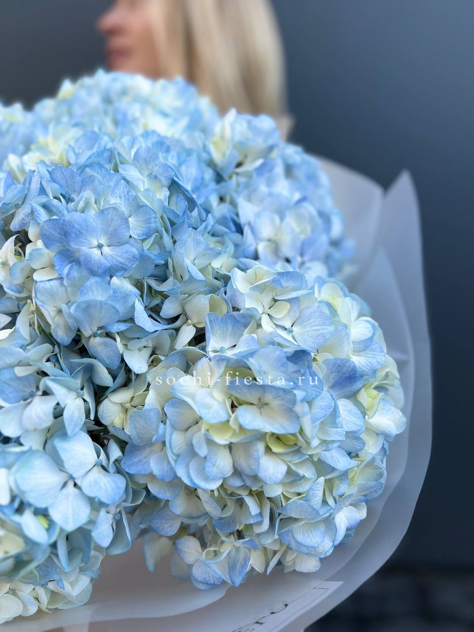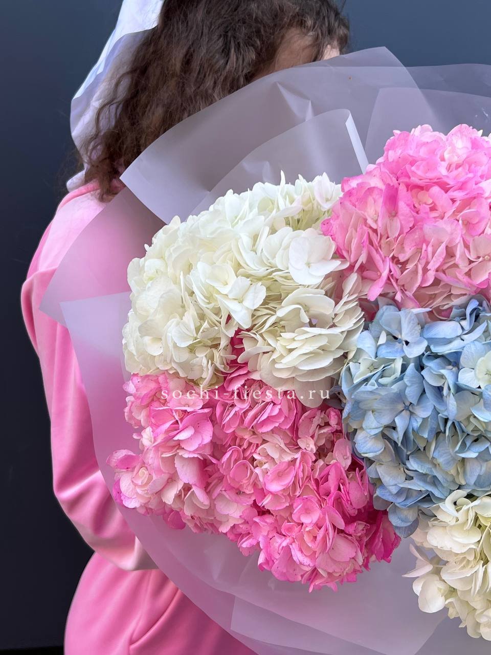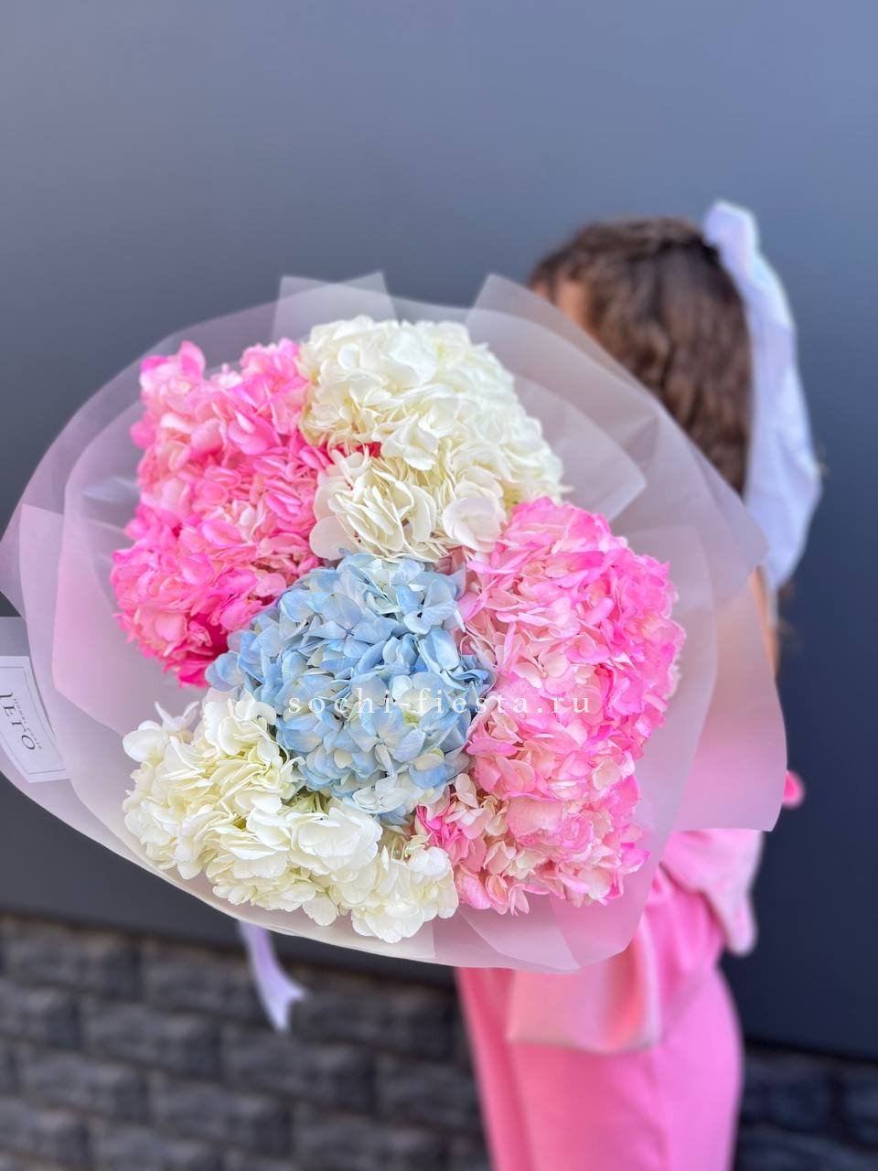 Букет из семи гортензий объединяет разные оттенки в единую композицию с живым ритмом. Переходы цвета создают динамику, а плотные соцветия формируют выразительный объём.