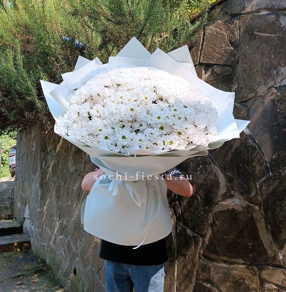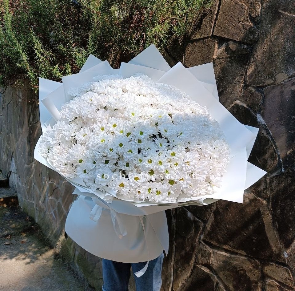 Девять кустовых хризантем собраны в плотный круглый силуэт. Каждая ветка раскрывается веером мелких соцветий, создавая объёмную текстуру. Букет держит форму и выглядит графично.