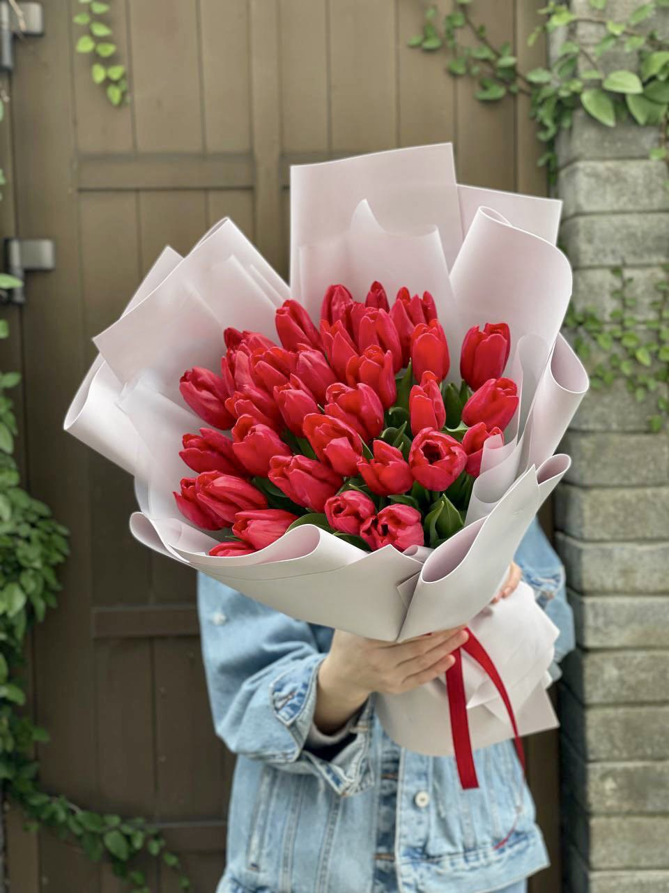 35 красных тюльпанов, лента, авторское оформление.