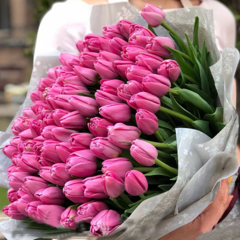 101 розовый тюльпан, лента, дизайнерское оформление.
