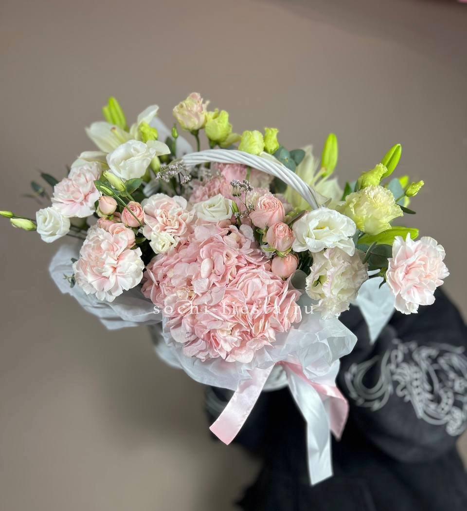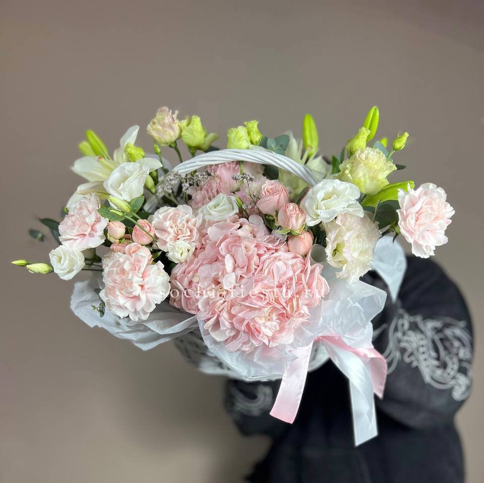 гортензии, роза одноголовая, роза кустовая, гербера, озотамнус, диантус, эвкалипт, декоративные перья, лента, дизайнерская упаковка.