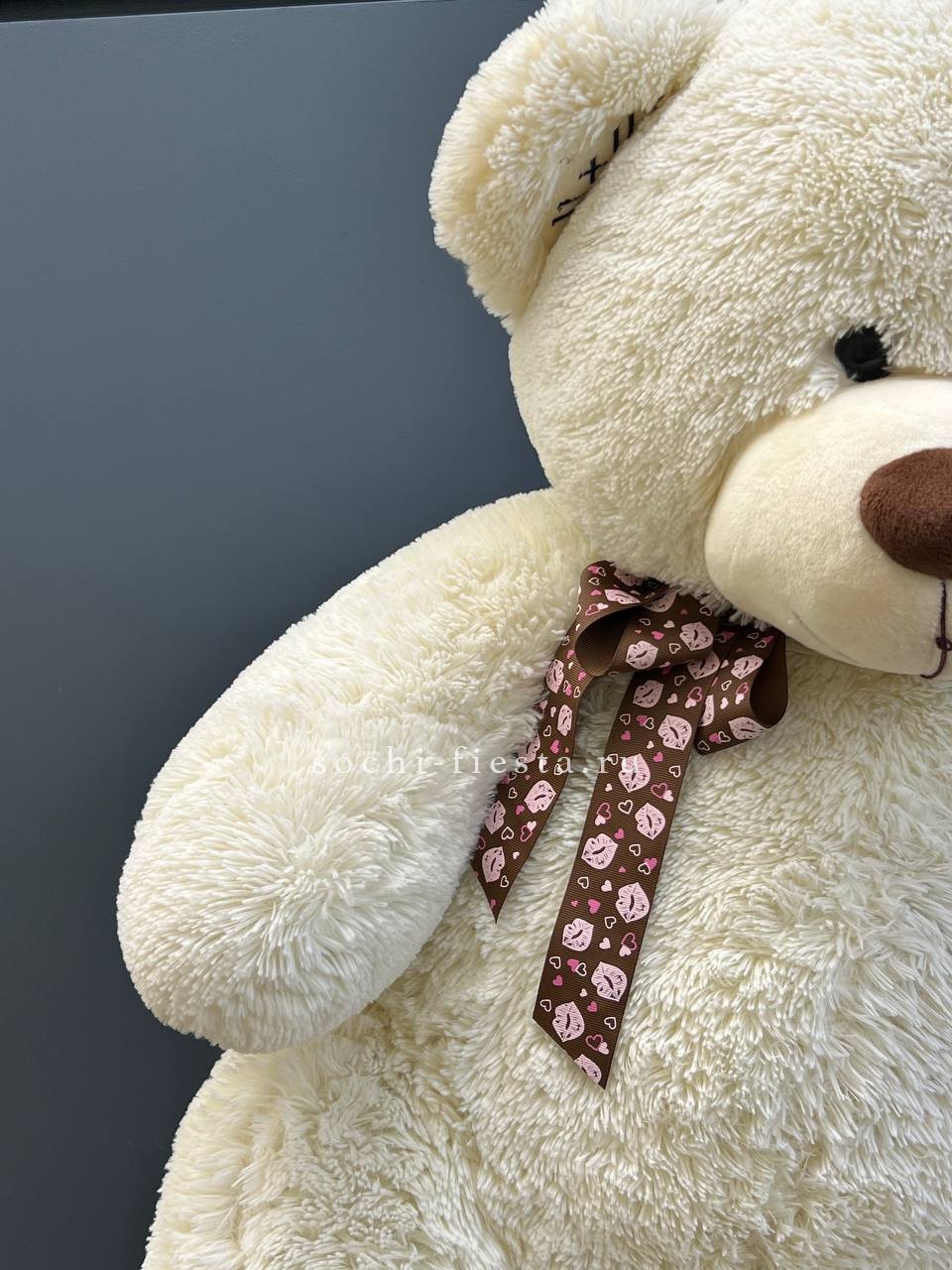 Мягкий плюшевый мишка метровой высоты с густым ворсом и добродушной мордочкой. Объемная фигура с крепкими лапами и округлыми формами создает ощущение уюта и надежности в любом пространстве.