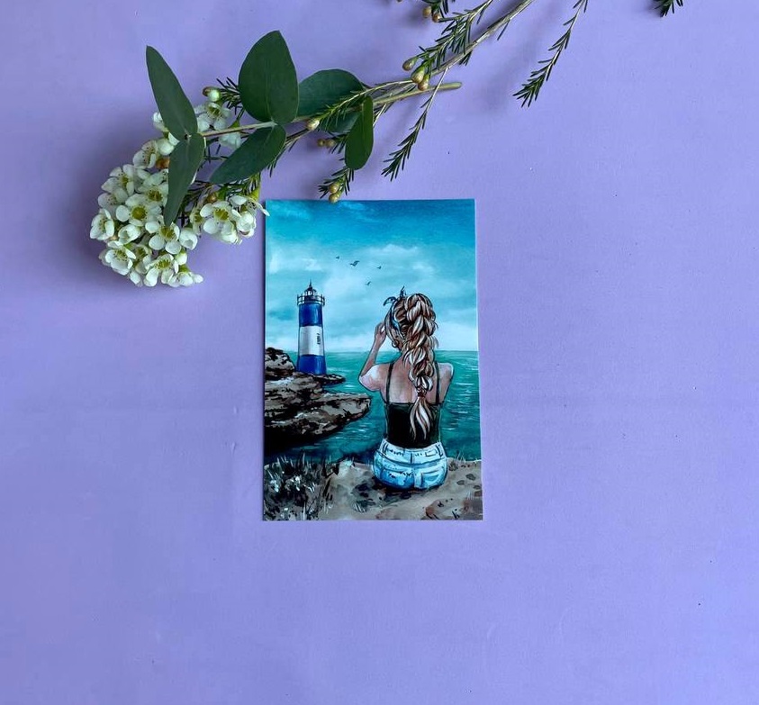 Морская палитра на открытке задаёт спокойный фон для личного текста. Формат рассчитан на несколько предложений и не перетягивает внимание на себя.
