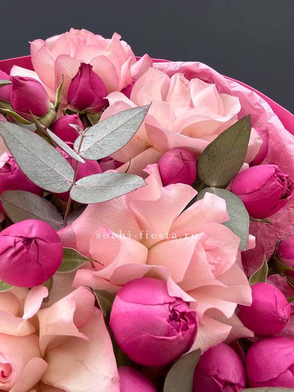 кустовые пионовидные розы Бомбастик, эвкалипт, цилиндр D13, бумага тишью, лента.