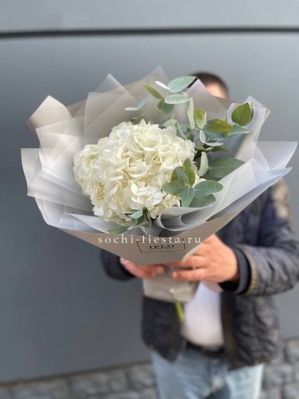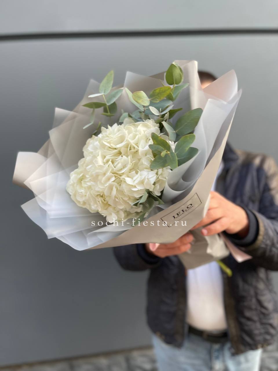 Пятнадцать вывернутых бутонов белого цвета раскрываются объемными шапками с волнистыми краями лепестков. Ветви эвкалипта добавляют букету воздушности и создают мягкую зеленую дымку вокруг цветов.
