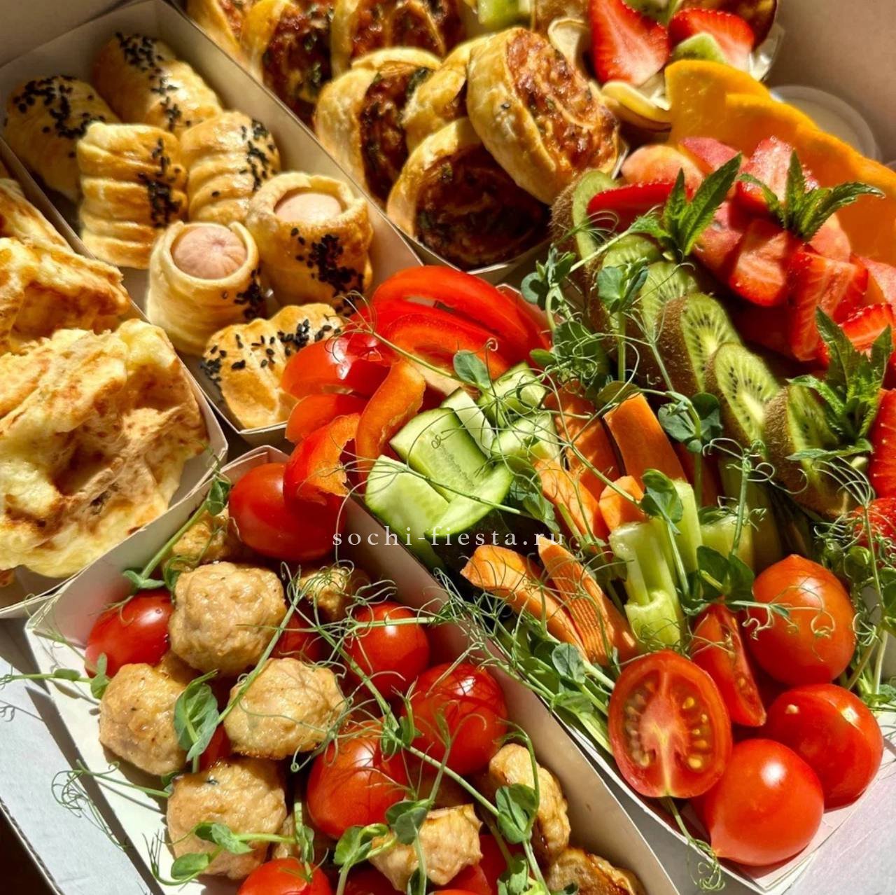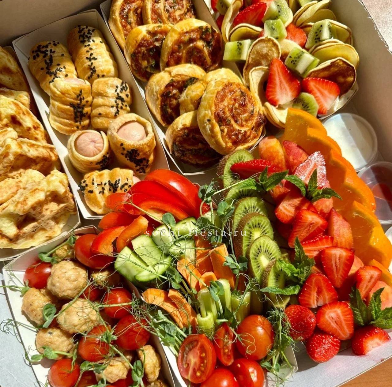 Семьдесят два варианта закусок собраны в одном боксе. Канапе соседствуют с картофелем в грудинке, а салаты на шпажках чередуются с хрустящими слойками — разнообразие для настоящего пикника.