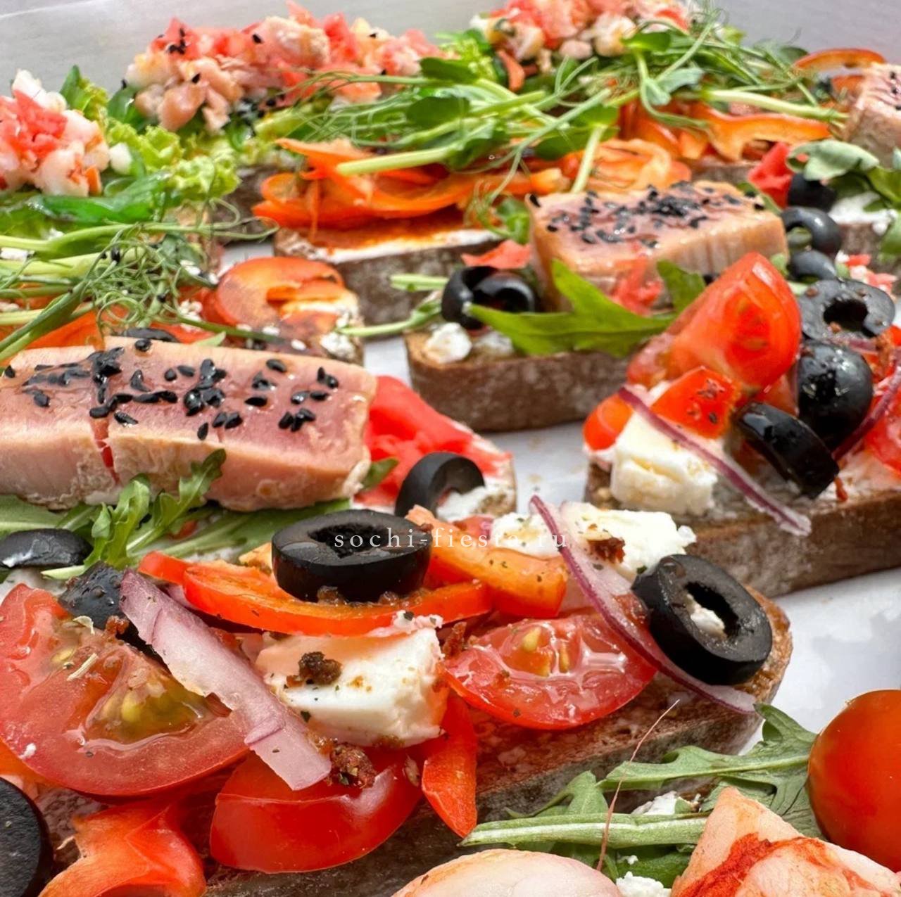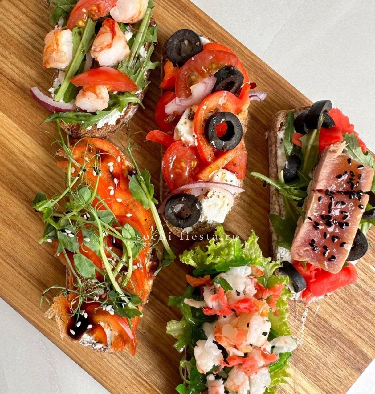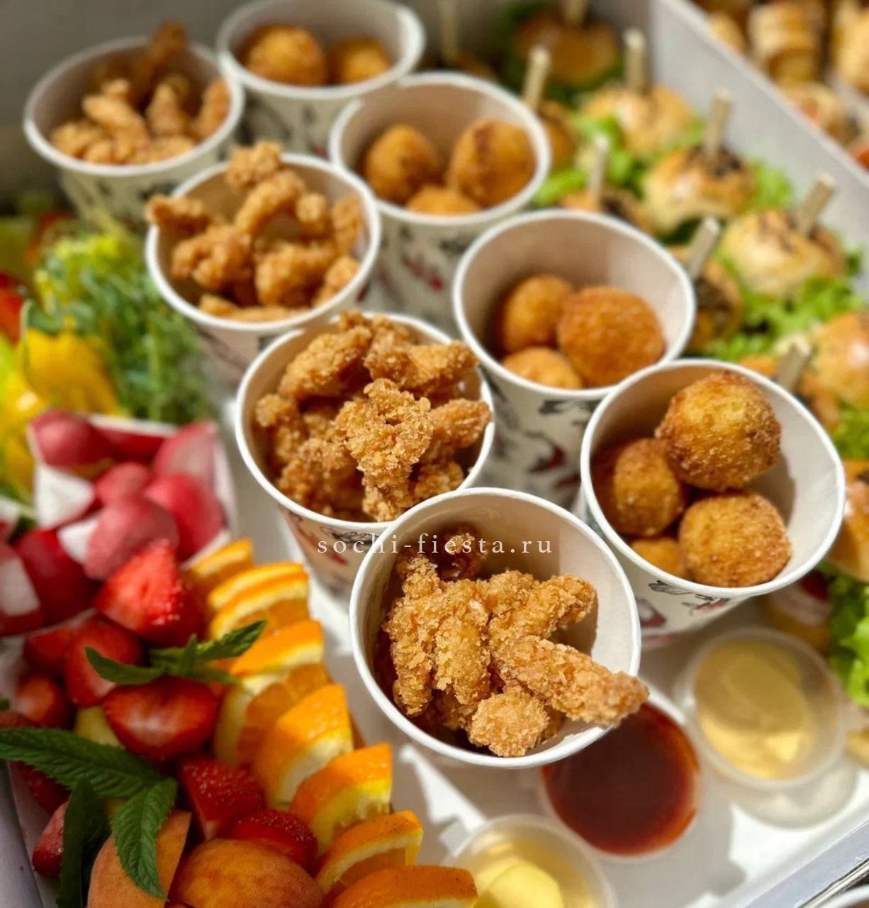 72 закуски. Ассорти мини-канапе закусочных — 32 шт. Картофель бейби в грудинке с корнишоном и черри- 10 шт. Салаты на шпажке: Греческий- 10шт. Цезарь с креветками— 10шт. Закуска к пиву хрустящая из слоеного теста с сыром и специями- 10шт.