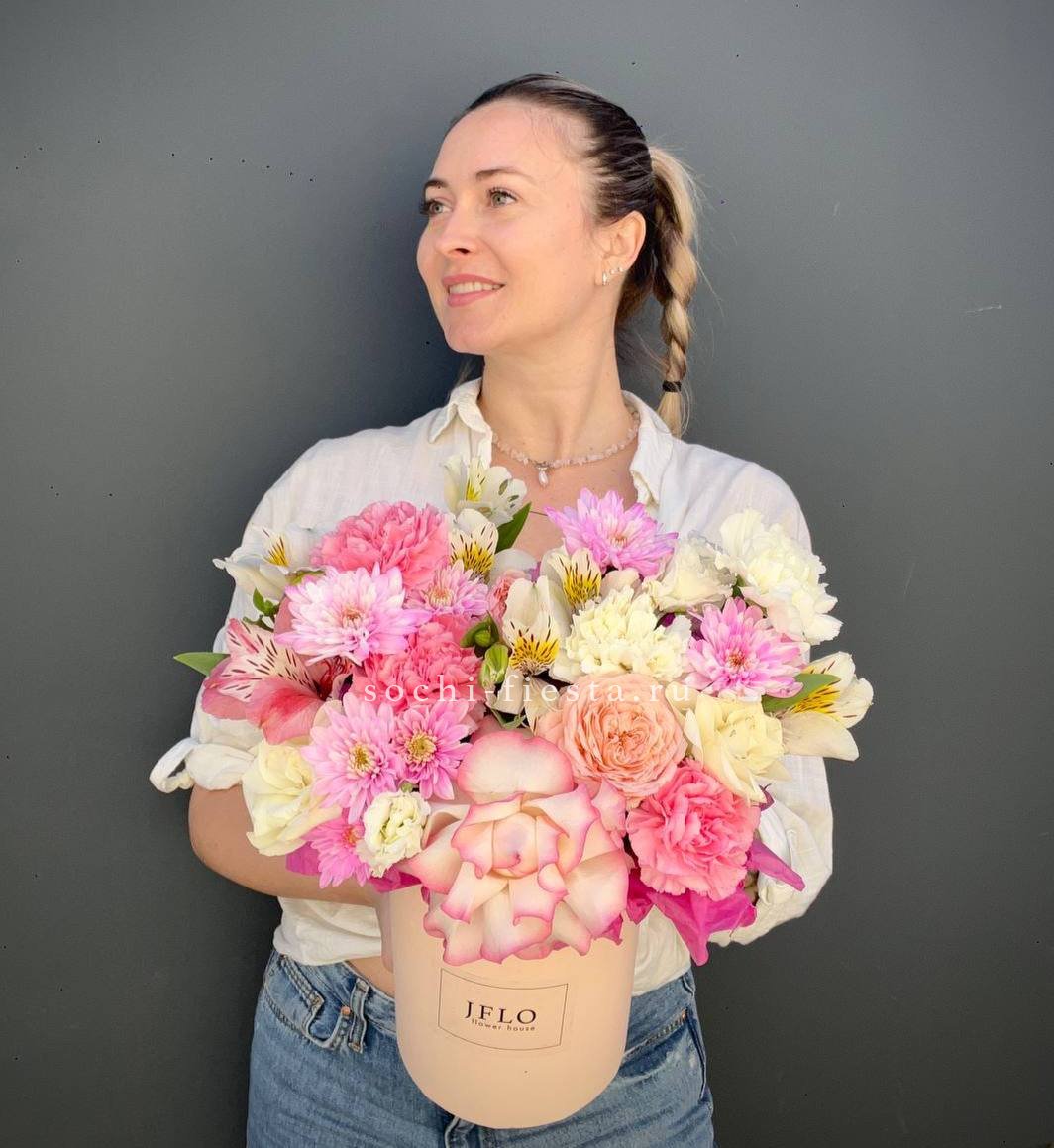 розы, альстромерии, хризантемы, диантусы, цилиндр D13,оазис, тишью.
