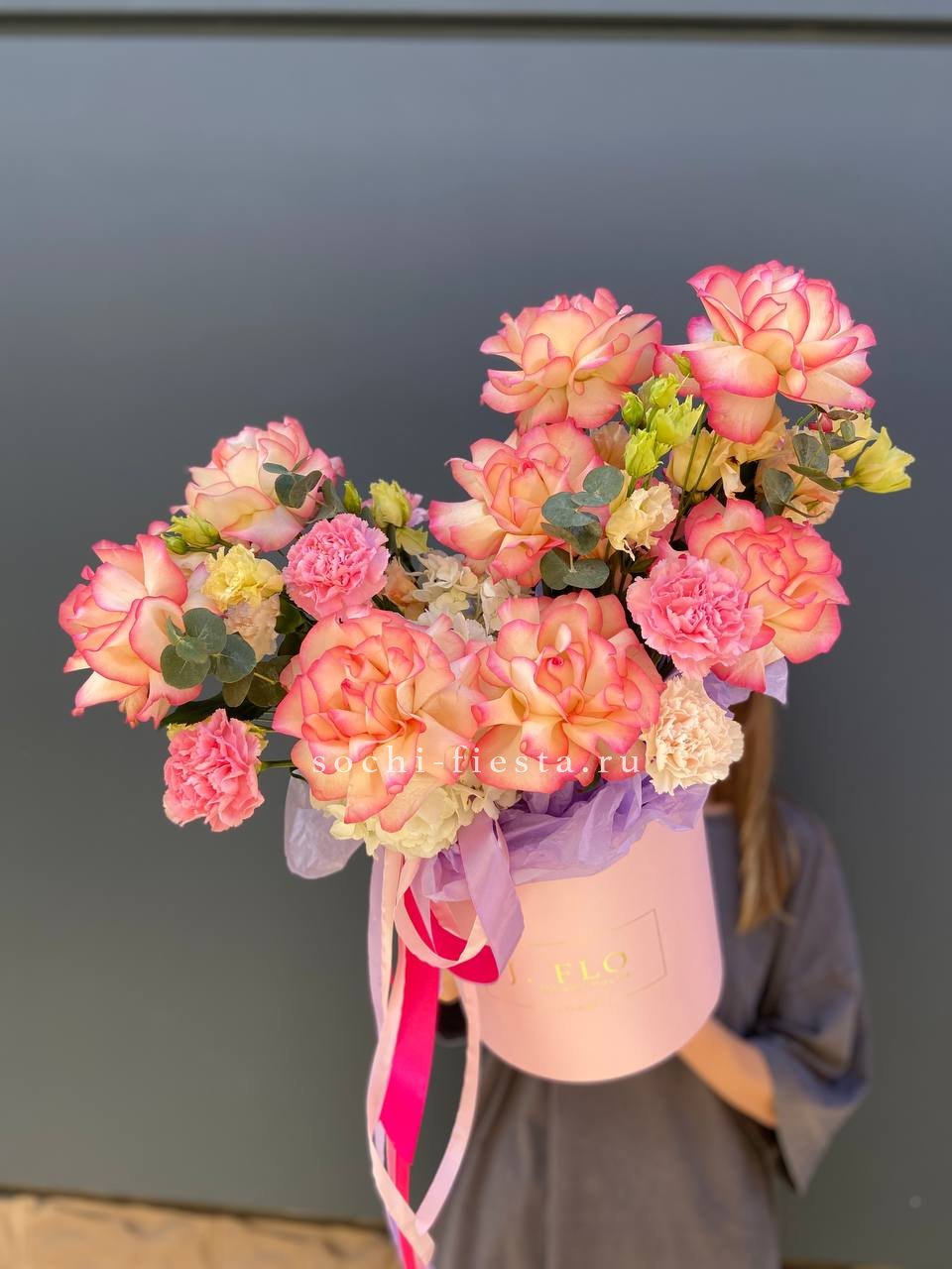 гортензии, эустома, розы, бомбастик, эвкалипт, антиринум в боксе 25.