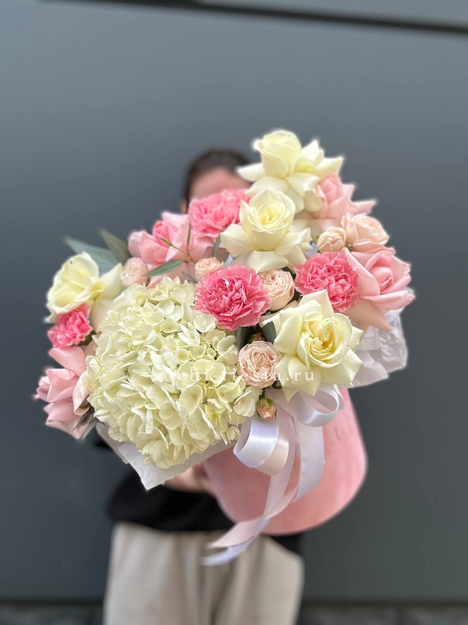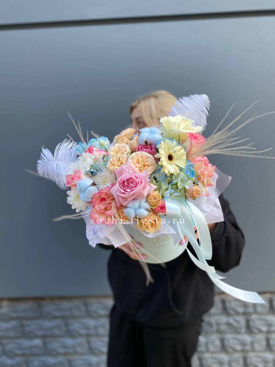 Розы, герберы и пышные соцветия гортензии в розово-голубой гамме наполняют бокс свежестью и легкостью. Каждый цветок раскрывается по-своему, создавая многослойную композицию. Готовое решение для яркого момента.