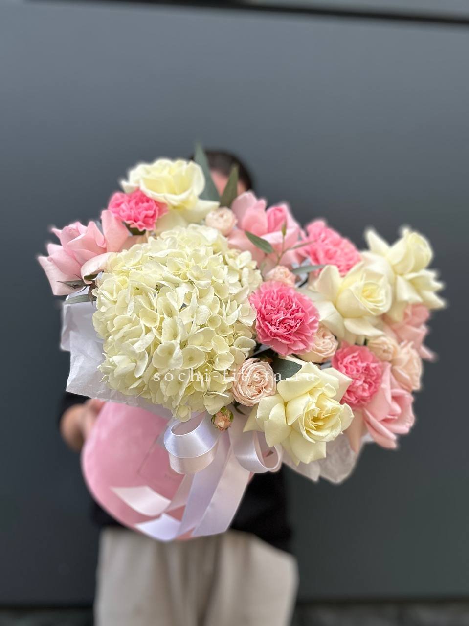 бокс из нежных розово-голубых цветов, розы, герберы, гортензии.