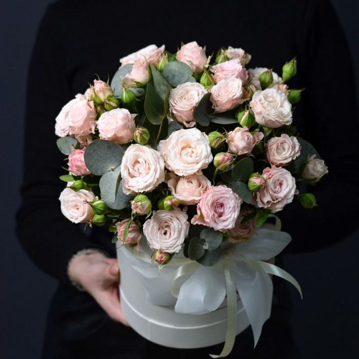 Пионовидная роза Бомбастик образует плотные бутоны с множеством лепестков. Эвкалипт добавляет свежести и завершает форму. Компактная коробка удобна для передачи из рук в руки.