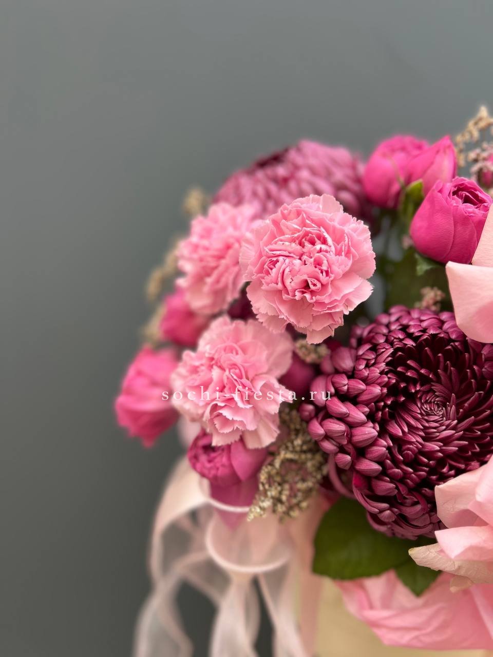 Хризантемы и диантусы задают воздушную текстуру, а мисти бабблс добавляет композиции объем. Лимониум вплетается между бутонами, создавая мягкую игру оттенков.