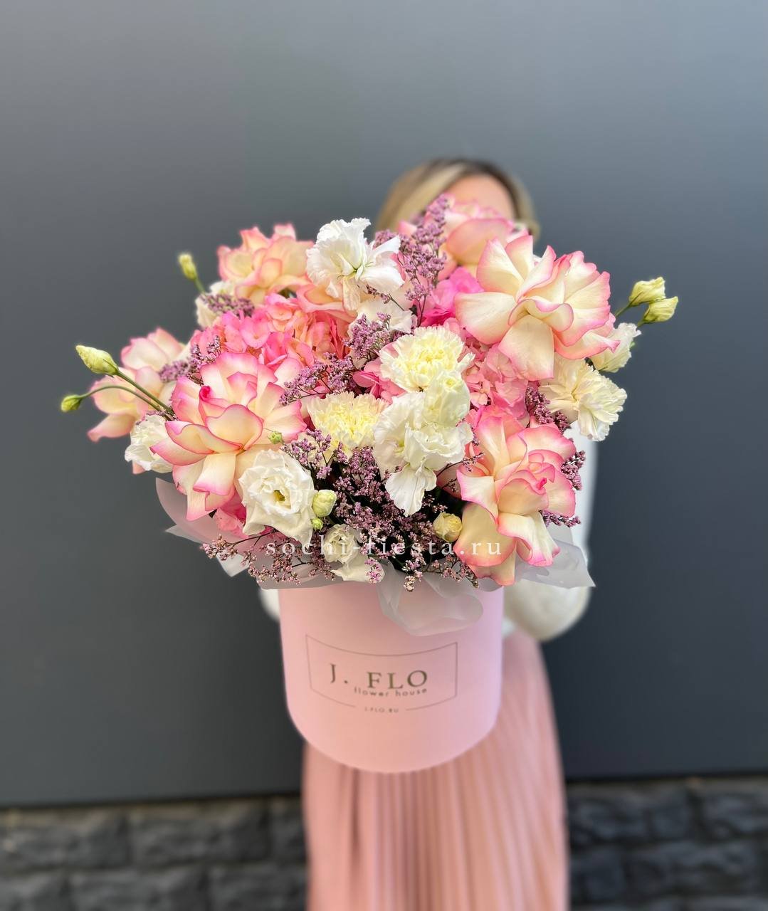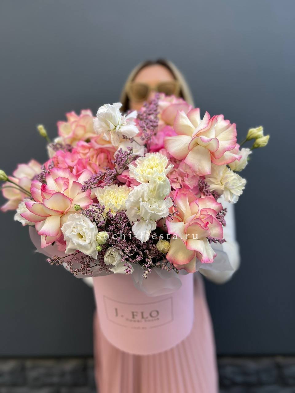 выполнен из эустом, французских роз, эвкалипт, цилиндр D20.