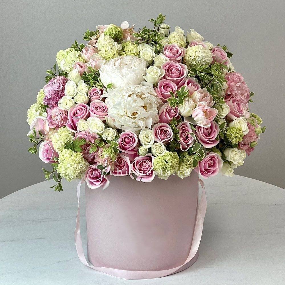 цветочная композиция в розово-белых тонах в розовом цилиндре D20-25.
