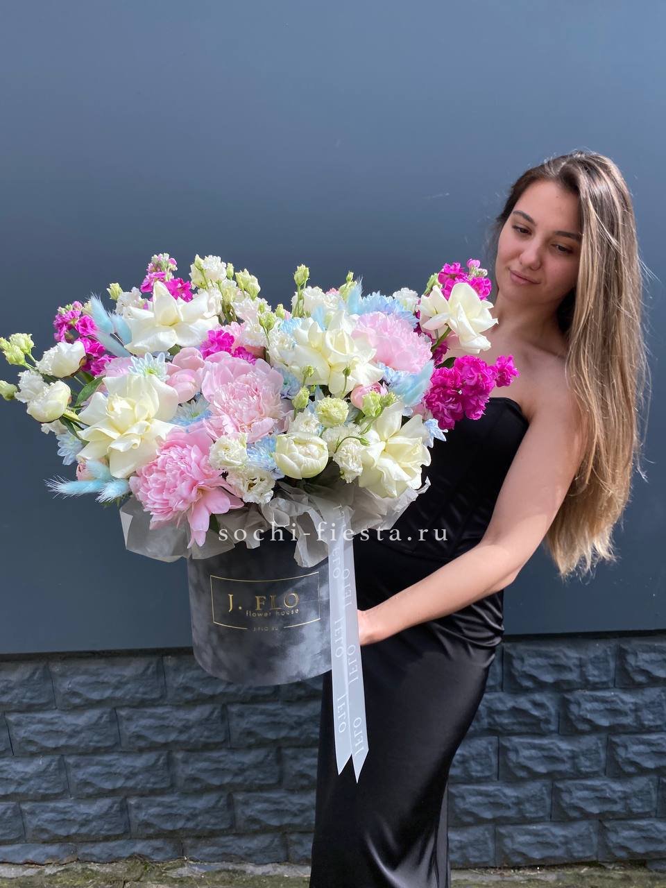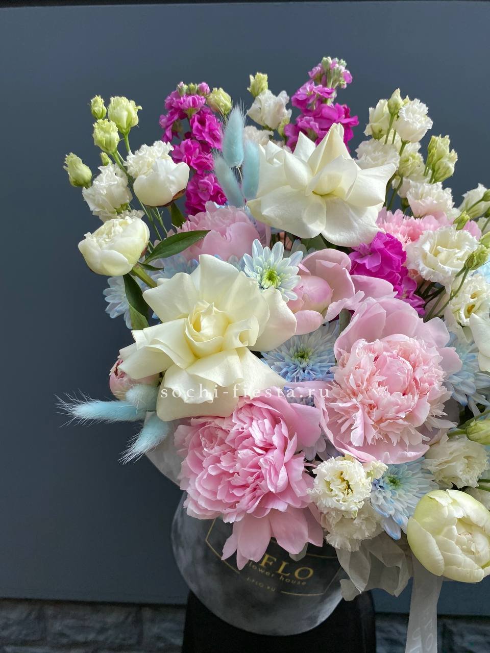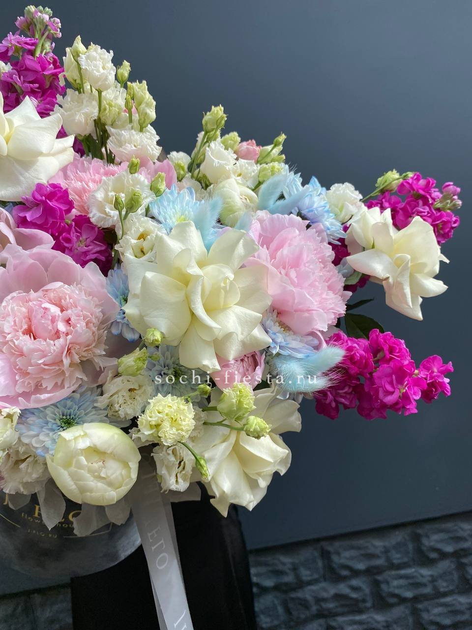 маттиола, пионы, белые розы, эустома, хризантемы, лагурус, бархатный цилиндр D20, эвкалипт, лента, упаковка.
