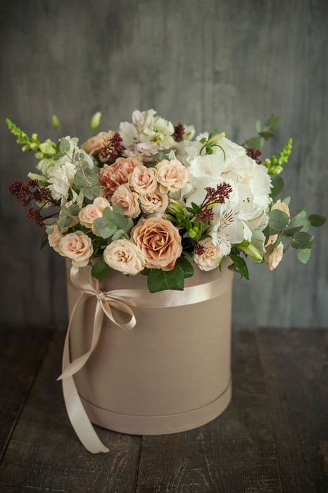 Мягкая палитра кофейных и кремовых тонов создает спокойное уютное впечатление. Гортензия и кустовые розы наполняют композицию воздушной фактурой.