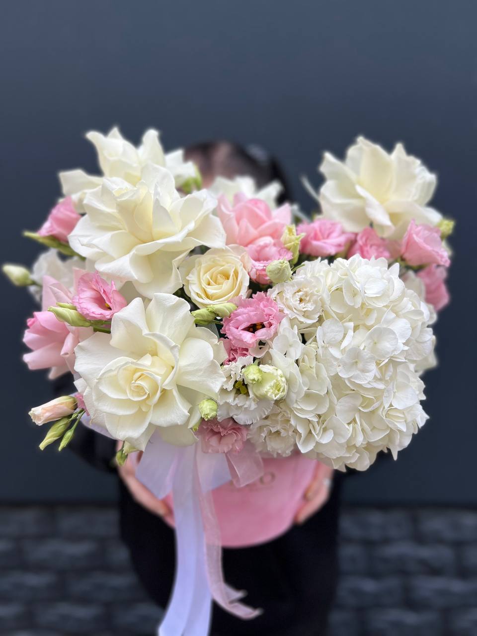 бокс, белая роза, розовая роза, эустома, гортензия, оазис.