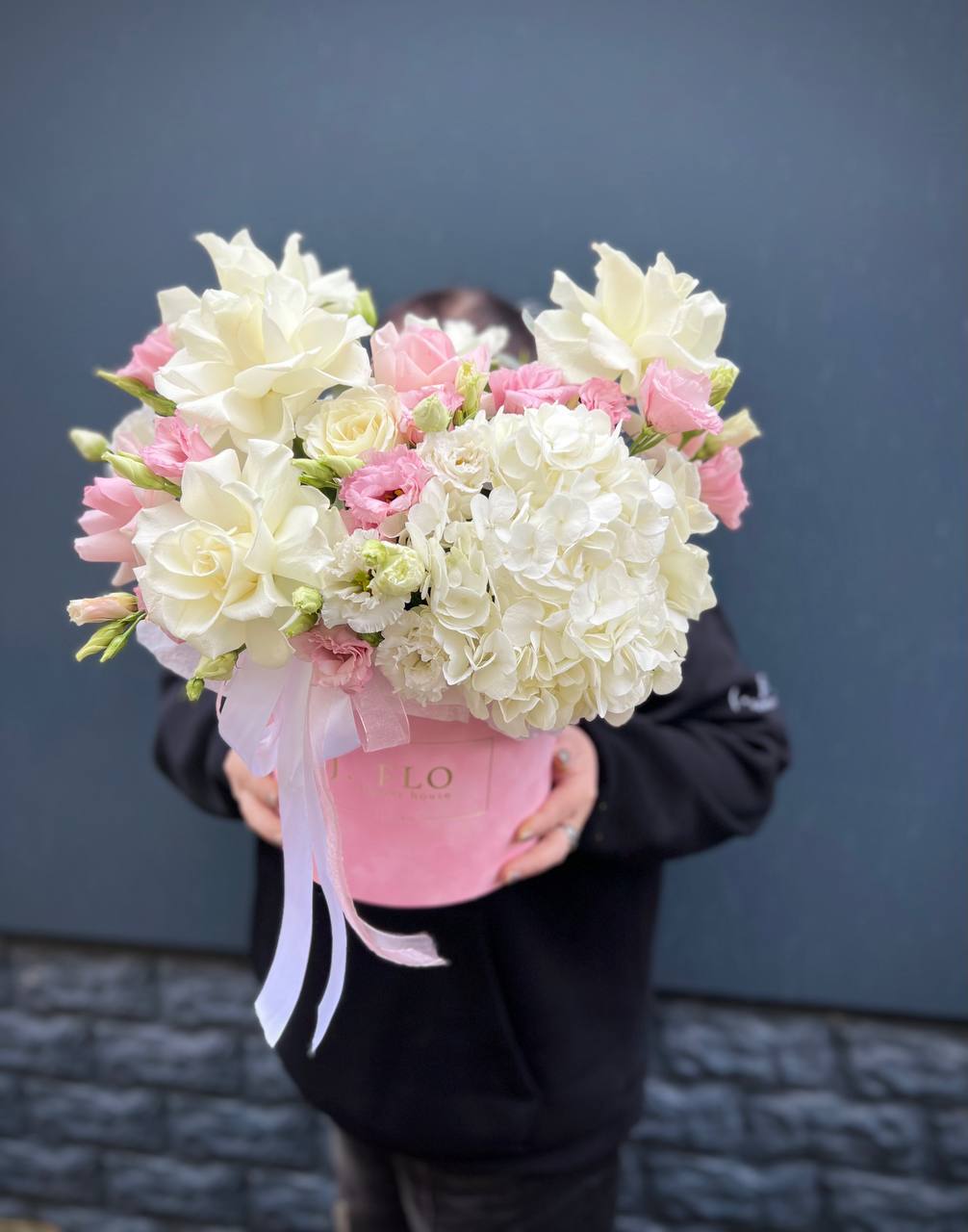 Воздушная композиция в бархатной коробке раскрывается пышными соцветиями гортензии и многолепестковыми бутонами эустомы. Розы двух оттенков создают мягкий переход от белоснежного к пудровому. Флористическая пена сохраняет свежесть каждого цветка надолго.