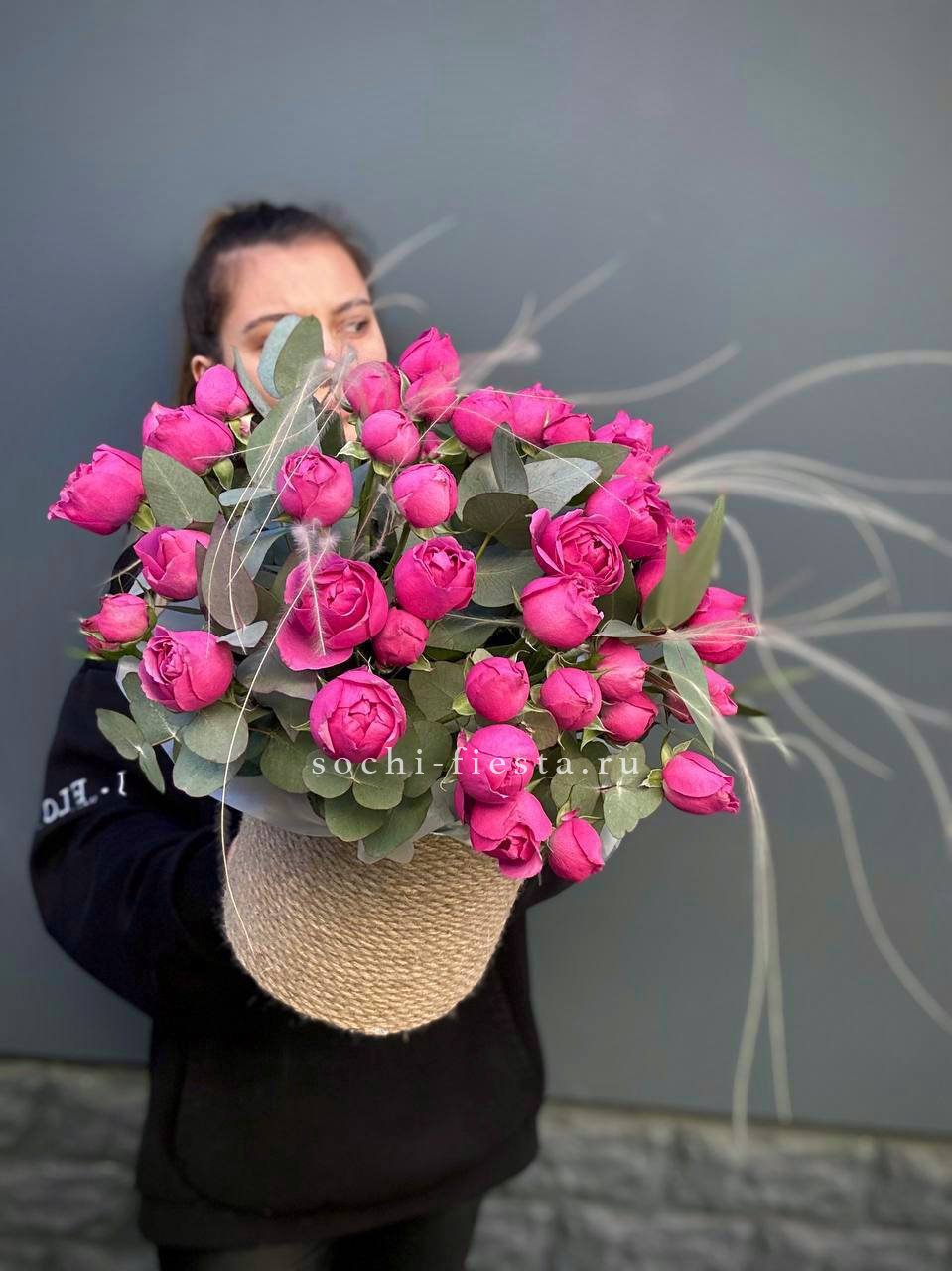 Пионовидные розы Мисти Бабблс в джутовом кашпо