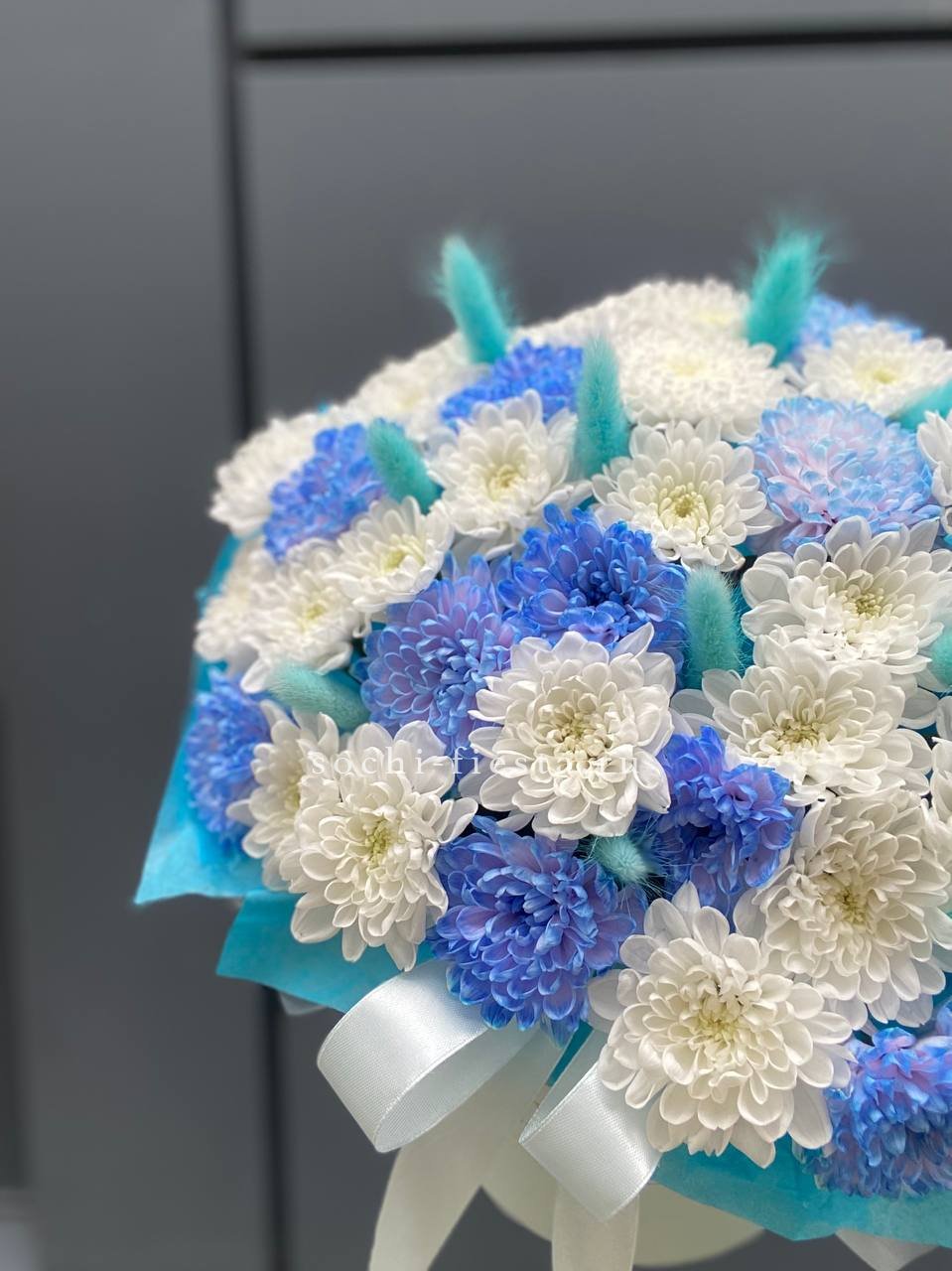 Пушистые соцветия хризантем и воздушный лагурус собраны в компактную коробочку. Голубая гамма напоминает морской бриз и летний день у воды.