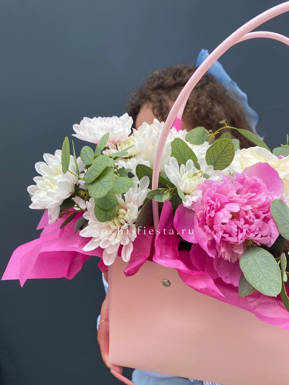 Пионы и хризантемы уложены в сумку-кашпо с лентой. Округлые головки пионов задают ритм, хризантемы поддерживают объем. Композиция выглядит собранно и свежо.