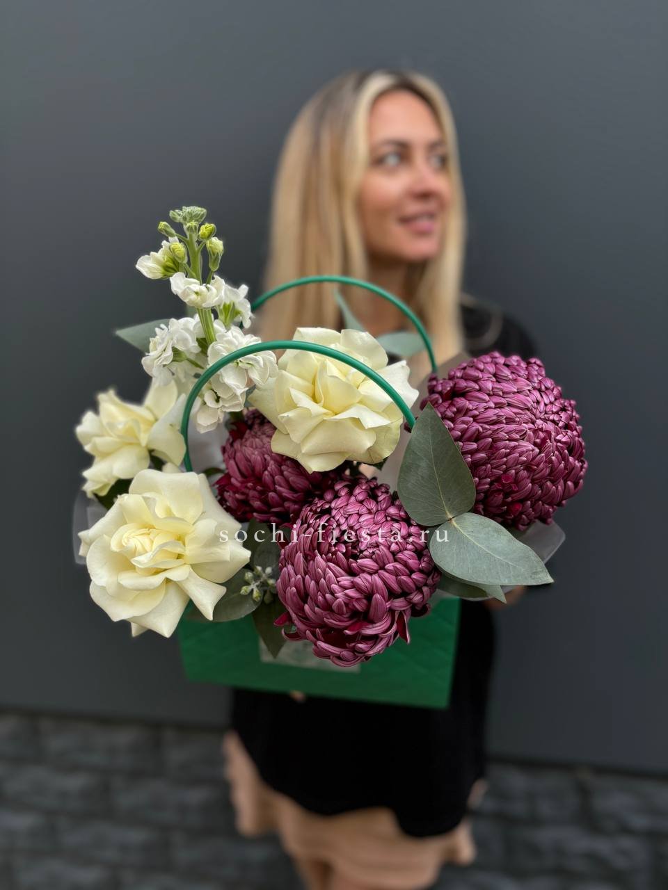 хризантемы бигуди, маттиола, розы,  эвкалипт, сумка.