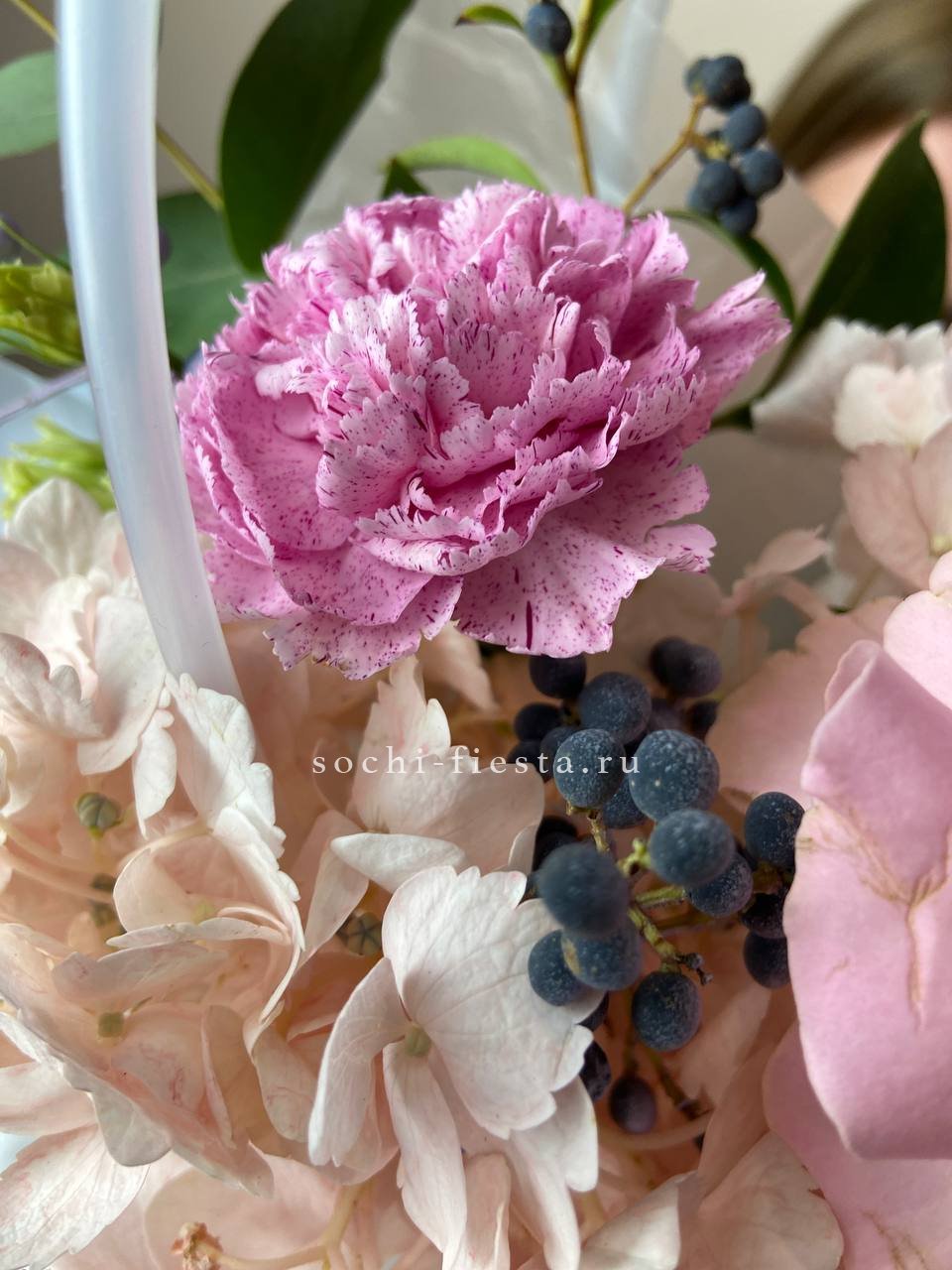 Воздушная композиция из диантусов и альстромерии в удобном формате. Цветы на оазисе держат свежесть долго и не требуют сложного ухода.