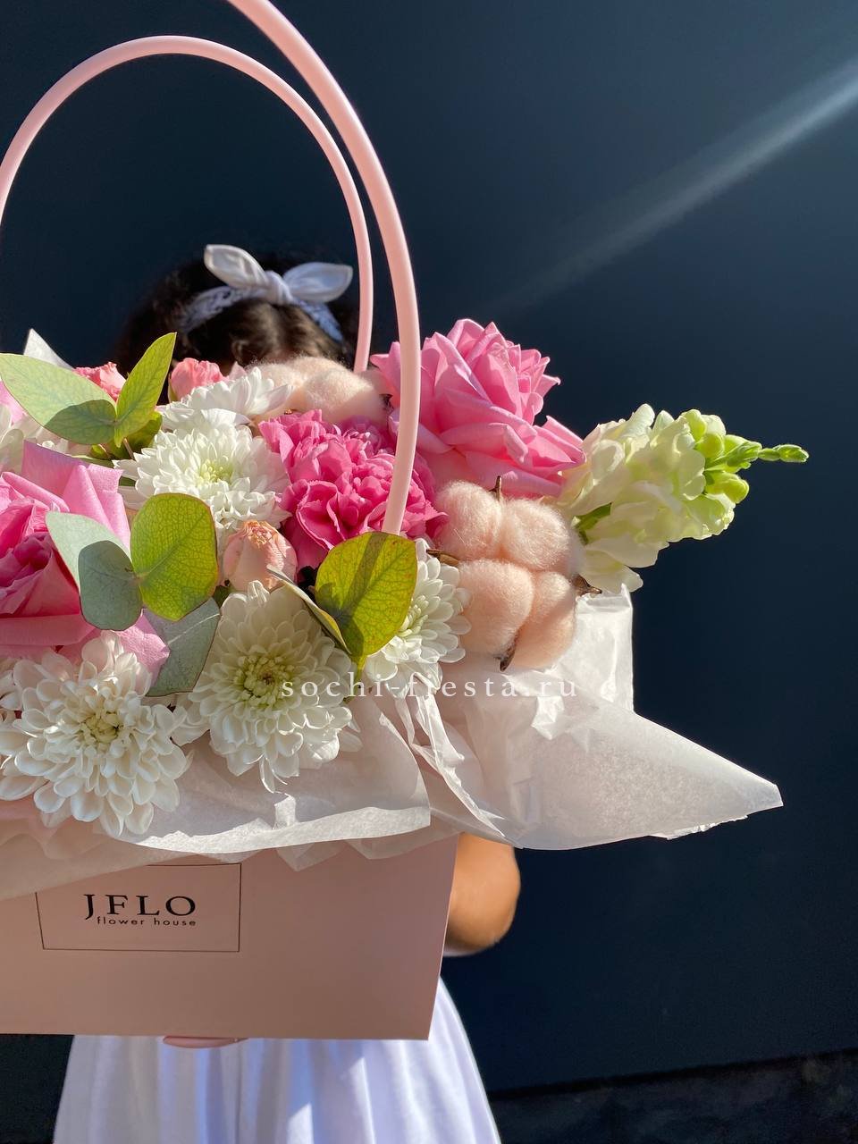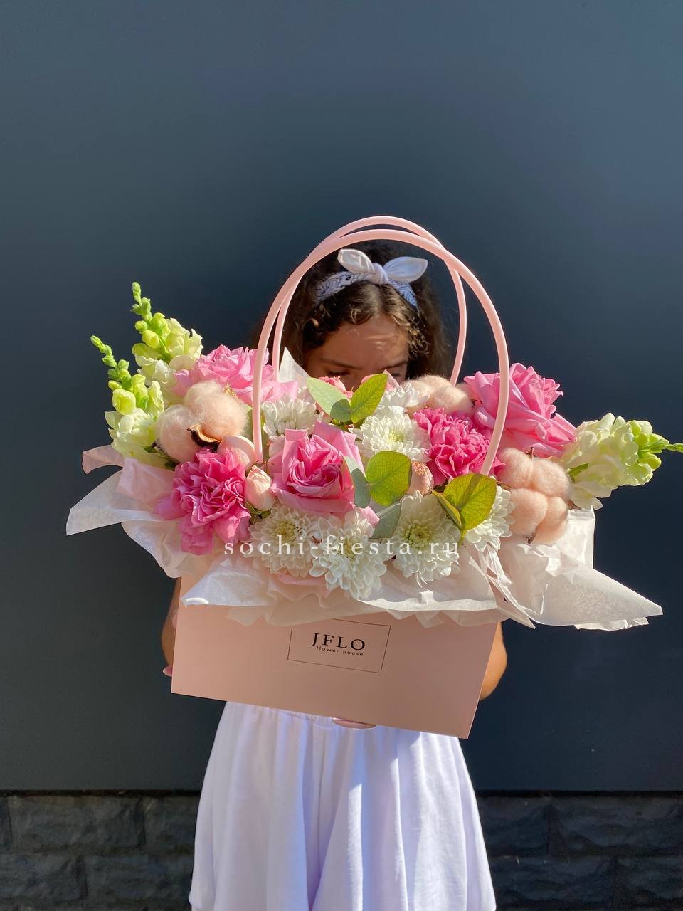 герберы , диантусы, белая роза, маттиола, хризантема кустовая, лента, сумка-кашпо.