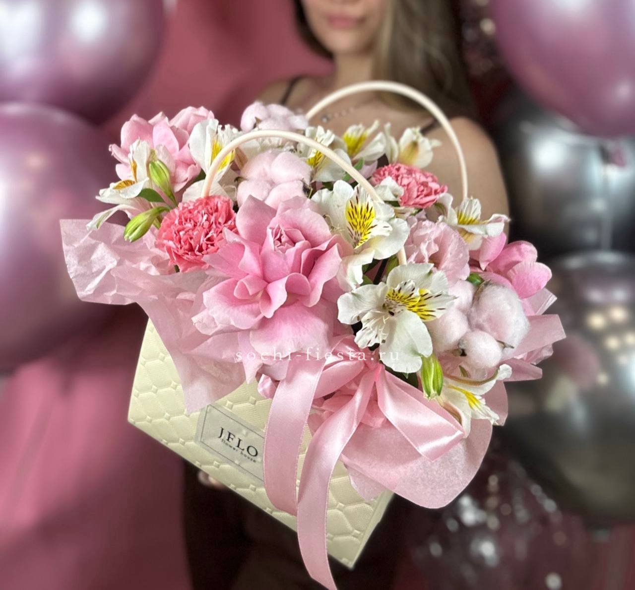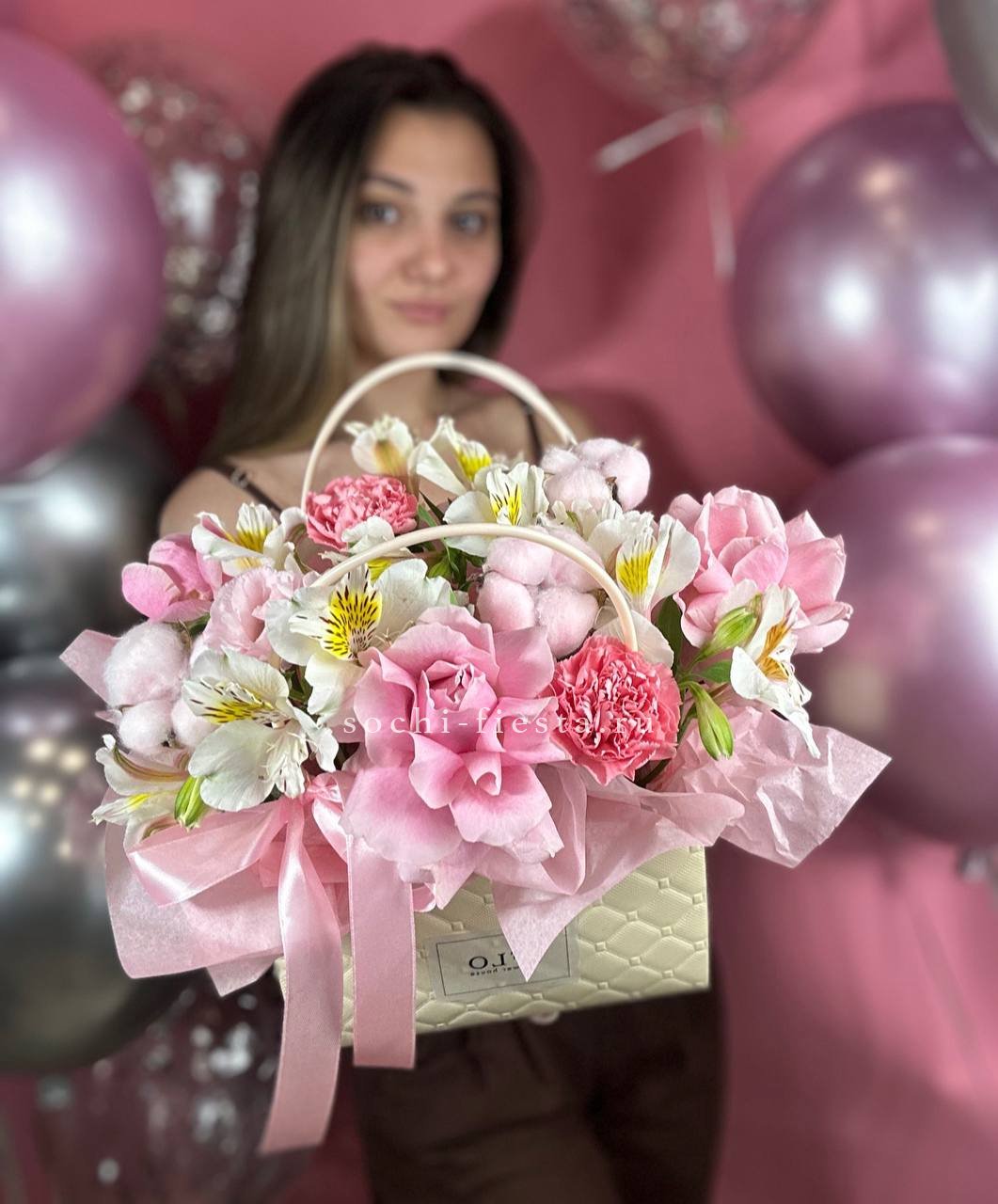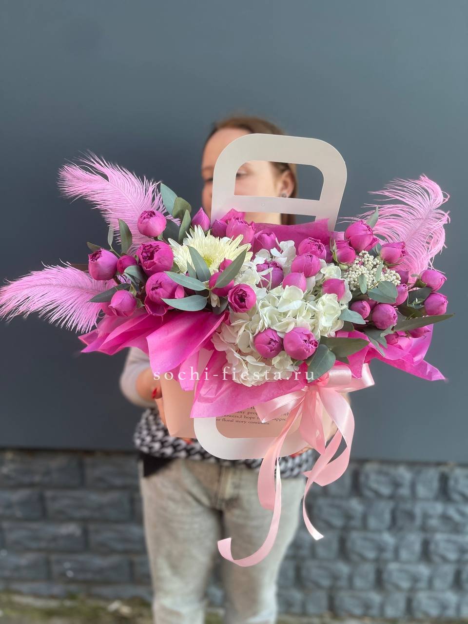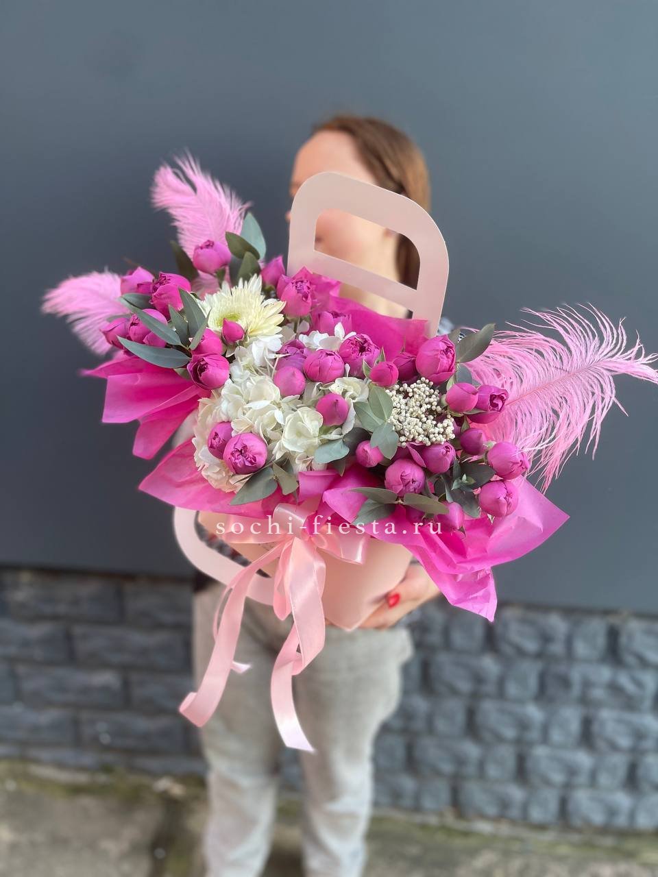 Голубая гортензия задаёт тон всей композиции, где хризантема и эустома создают объём, а хлопок с лагурусом добавляют воздушности. Сумочка вмещает насыщенную палитру без перегруженности.