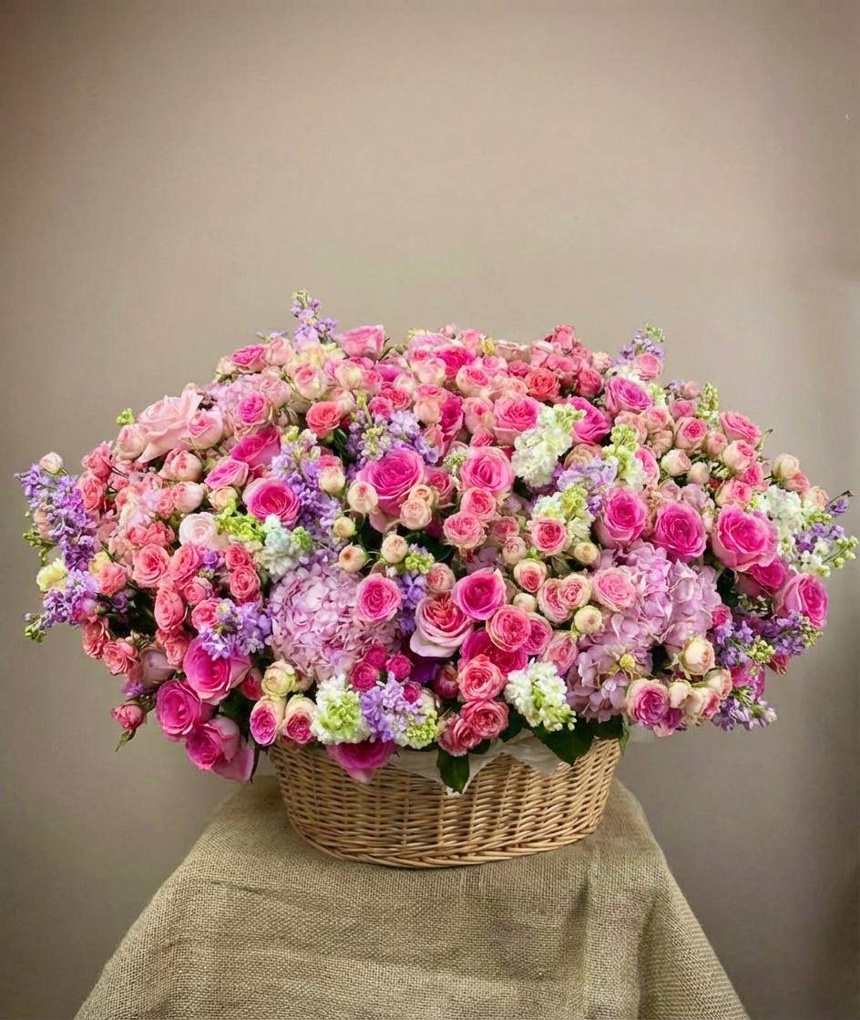 Корзина с шестьюдесятью пятью кустовыми розами Мисти Бабблс создаёт плотное облако из махровых бутонов лавандового оттенка. Эвкалипт добавляет свежести и завершает композицию.