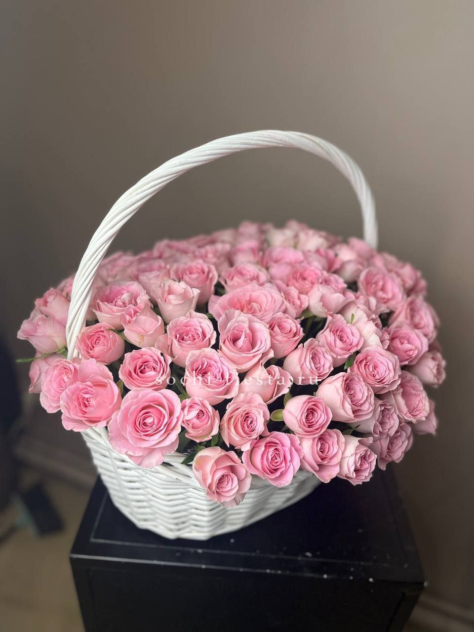 маттиола, гортензии, кустовые розы, розовые розы в корзине.