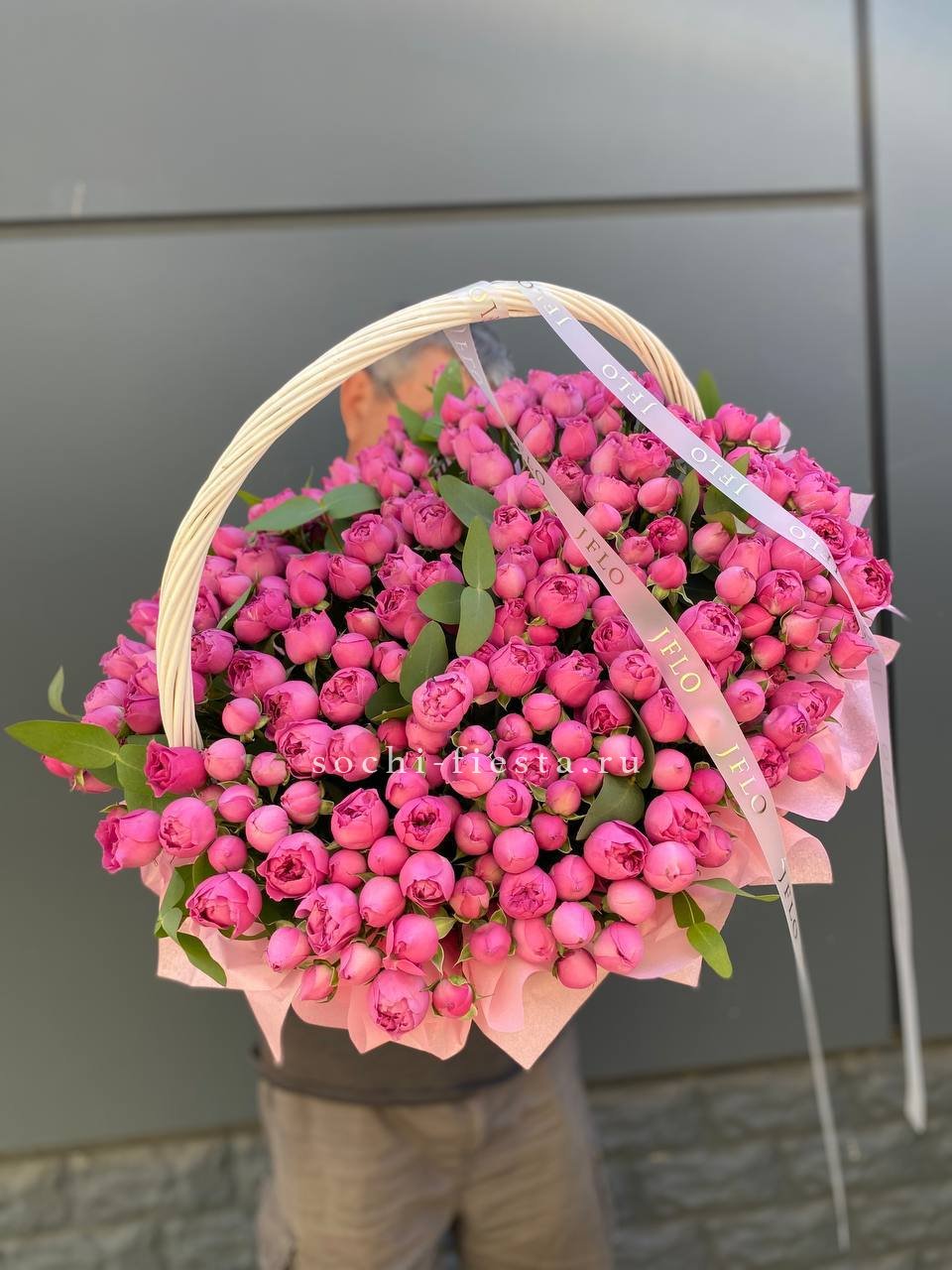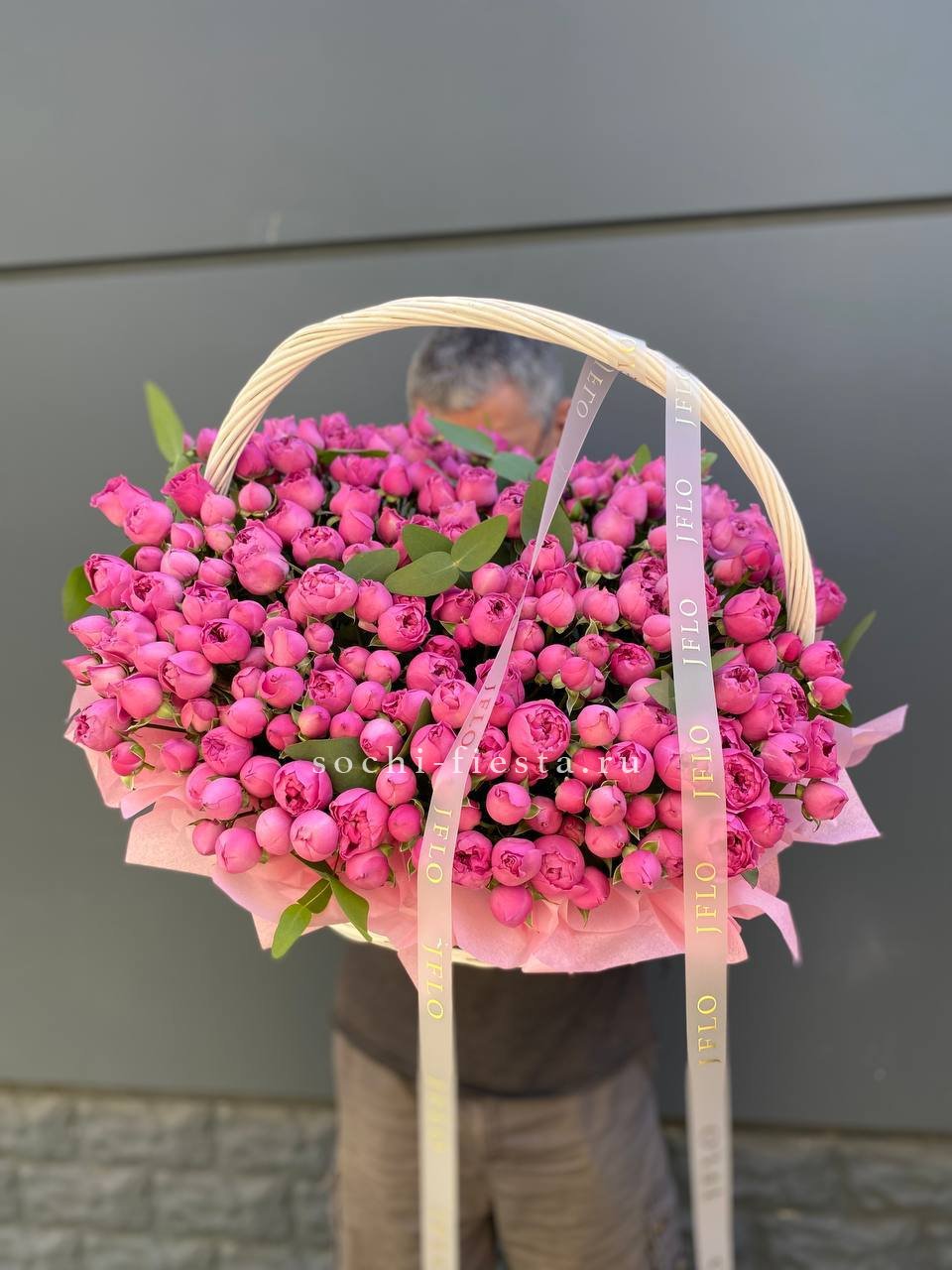 Букет сохраняет свежесть и форму благодаря устойчивой основе корзины.