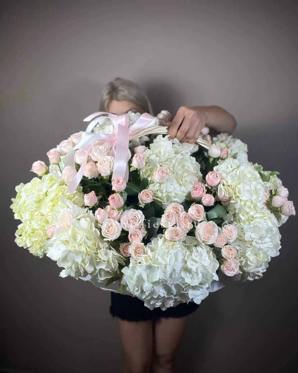 Двадцать пять французских роз в корзине создают плавный переход от светлых розовых тонов к насыщенной фуксии. Эвкалипт добавляет свежести и завершает композицию естественной зеленью. Букет удобно разместить на столе или комоде благодаря устойчивой корзине.