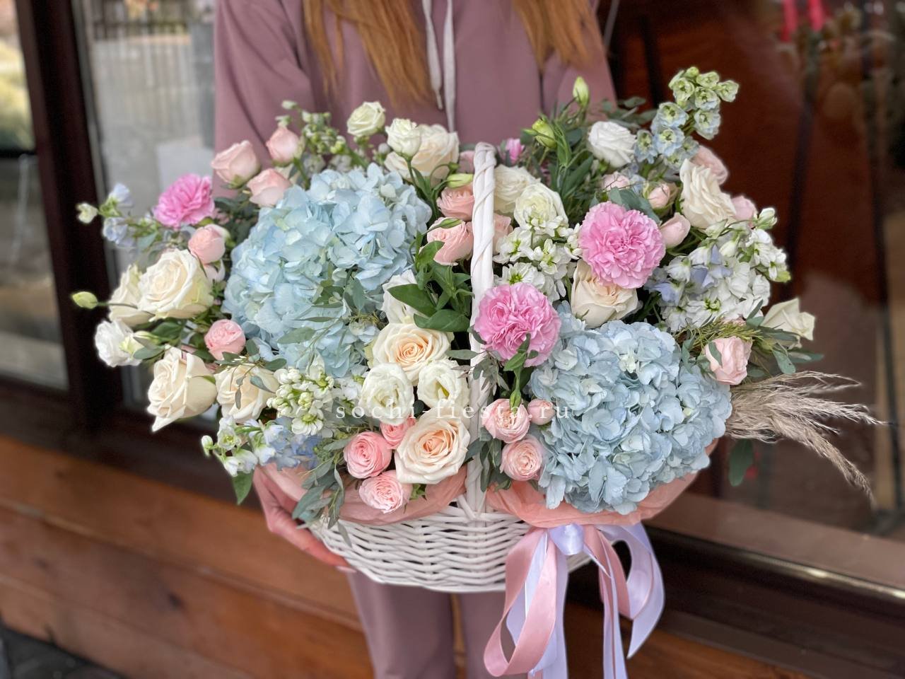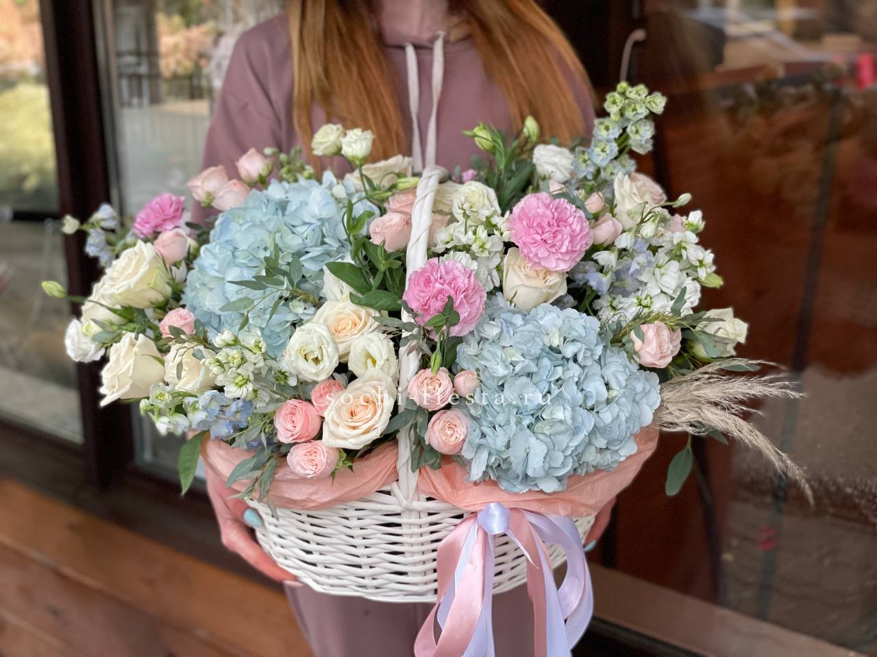 гербера, гортензия, диантус, хайди, эустома, эвкалипт, корзина средняя.