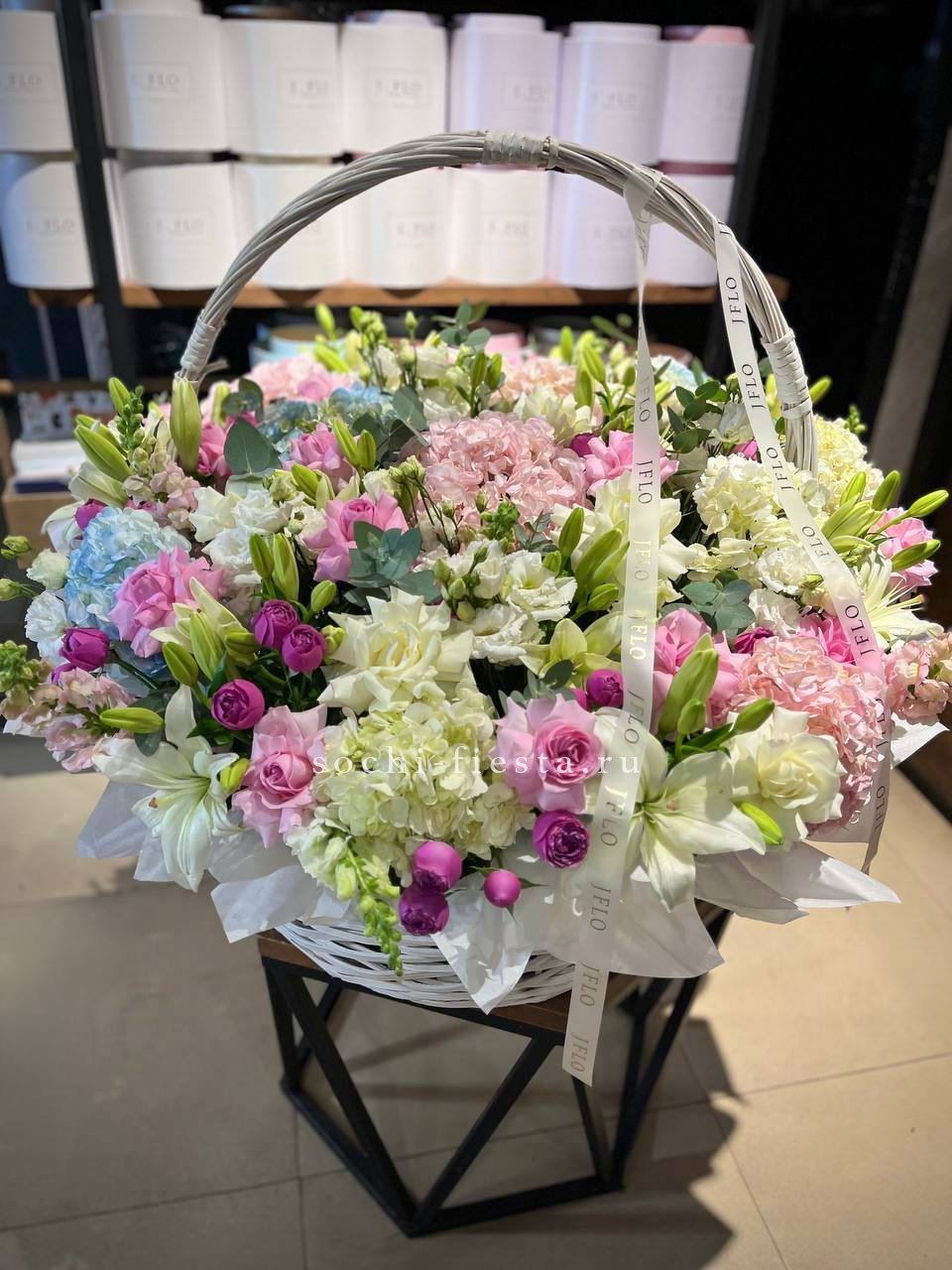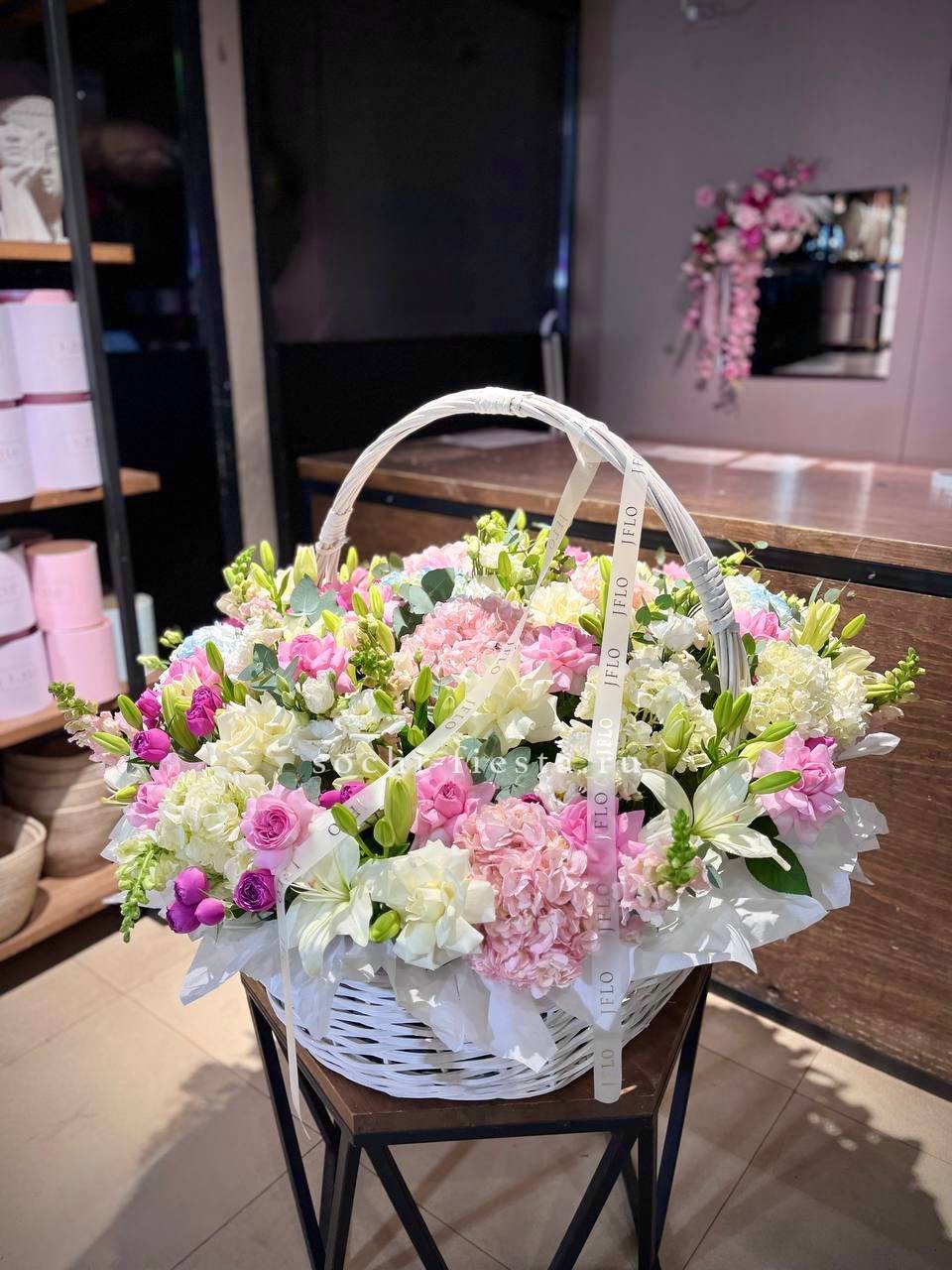 Гортензия и эустома задают объём, а яркие герберы расставляют цветовые акценты по всей композиции. Диантус и хайди добавляют воздушности, эвкалипт завершает силуэт мягкими линиями. Корзина держит форму и создаёт устойчивую основу для пышной композиции.