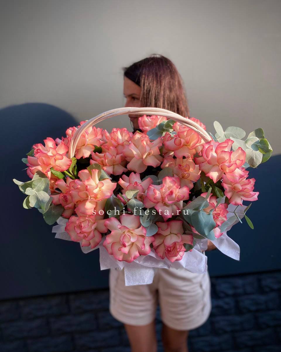 диантус, роза кустовая, гипсофила, гортензия, дельфиниум/львиный зев/маттиола (замена вне сезона), белая роза, георгины или аналог, эвкалипт, оазис, корзина D 25, двойной бант Состав композиции может быть незначительно изменен флористом в процессе изготовления с соблюдением стилистики, фактуры и цветовой гаммы оригинала.